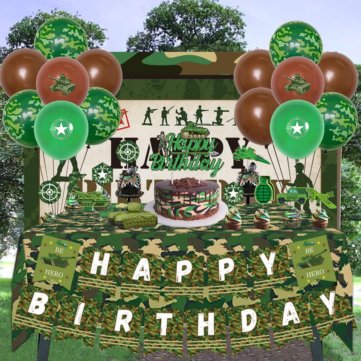 Soldier Theme Happy Birthday Backdrop And Camouflage Tablecloth Materials: ? Happy Birthday Backdrop: Premium Vinyl ? Camouflage Tablecloth: Plastic Size: ? Backdrop (5X3Ft/150Cm X 90Cm) ? Tablecloth (4.2X7.2Ft/130Cm X 220Cm) Package Includes: ? 1 X Happy Birthday Backdrop ? 1 X Camouflage Tablecloth