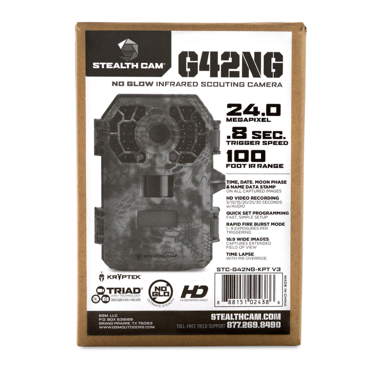 Stealth Cam'S G42Ng Comes Packed With Features For The Next Generation Hunter. The 32Mp Trail Camera Captures High-Quality 32Mp Pictures And 5- To 180-Second Of Hd Videos With Audio. The No Glow 42 Black Ir Emitters Allow A 80 Foot Visibility Range In The Dark Yet Won'T Spook Nighttime Game . Retina Low-Light-Sensitivity Technology Catches Light And Disperses Ir Illumination To Create A Detailed, Evenly Lit Scene. Matrix Blur Reduction Takes Crisp Images Of Moving Subjects In Ir Mode. Multi-Zone Detection Offers More Accurate Coverage, While The Reflex Trigger Snaps Pictures In Under Half A Second. Rapid-Fire Burst Mode Takes Up To Nine Photos After Being Triggered, And Time-Lapse Mode With Pir Override Catches Images Of Game Over Set Periods Of Time.Set Upfast Setup With Preprogrammed Or Manual Modes. 5- To 59-Second And 1- To 59-Minute Recovery Timeout. Secure Password. Time, Date, Moon-Phase, Temperature And Name Stamps. Intuitive 2.4 Inch Color Tft Screen. Accepts Sd Cards Up To 32Gb (Not Included).Uses 8 Aa Batteries (Not Included). External Power Jack For 12-Volt Battery. 5-1/2 Inches H X 4 Inches W X 2-1/2 Inches D.