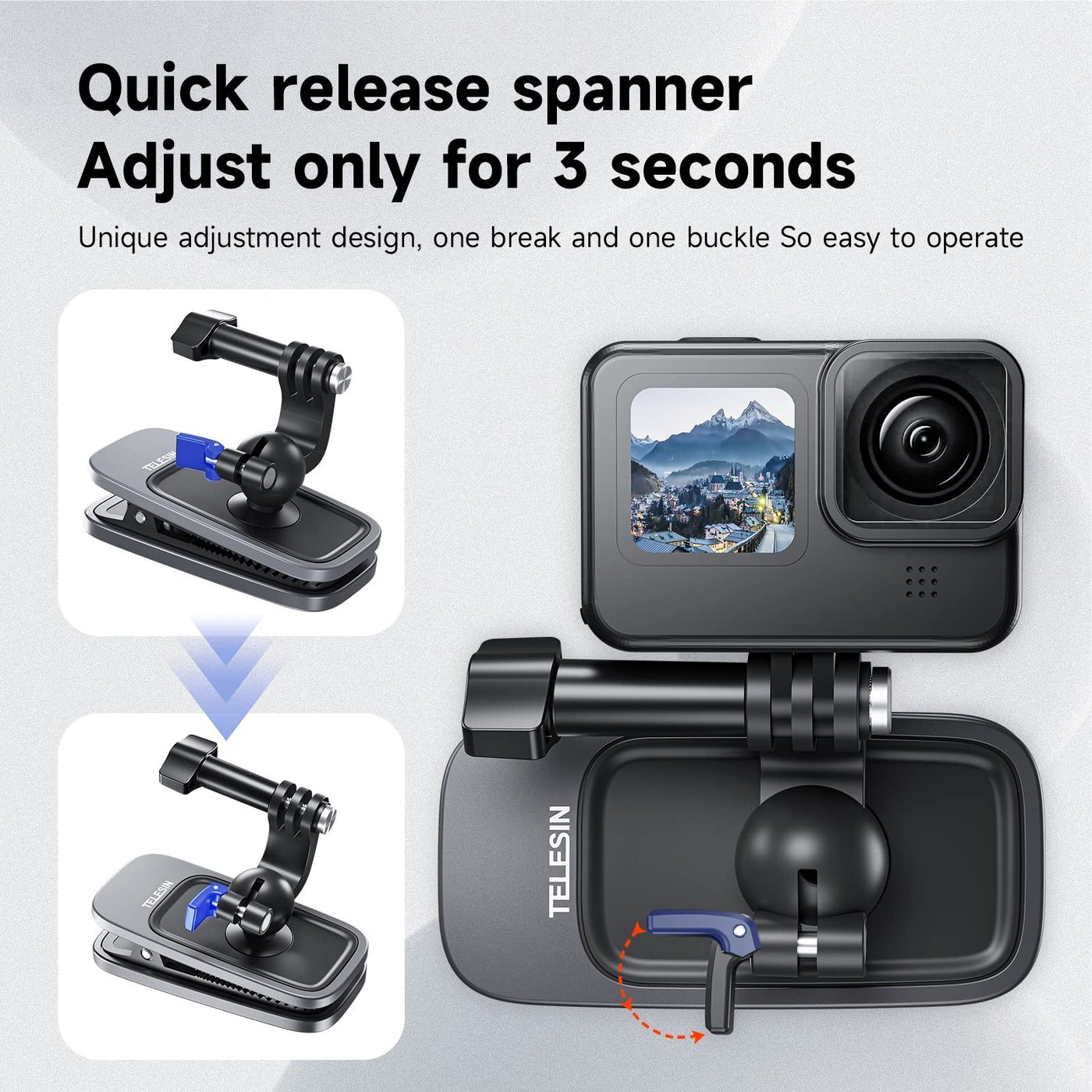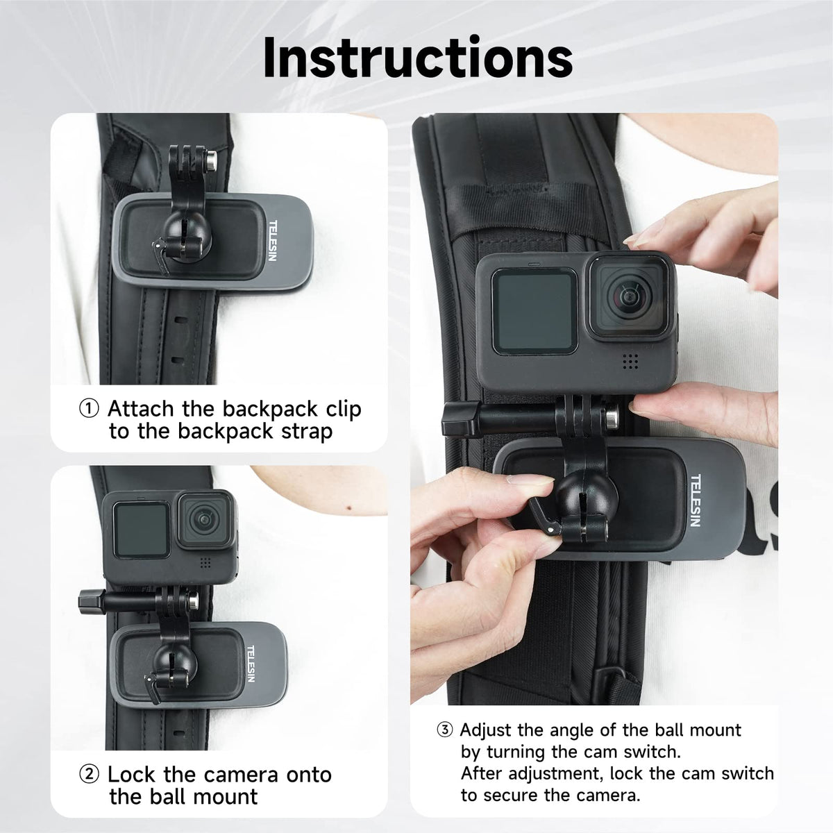 Telesin Backpack Clip Mount With 360 Ball Joint Bag Belt Shoulder Strap Holder Attachment For Gopro Max Hero 12 11 10 9 8 7 6 5, Insta360 X3 X4 Go3 Ace Pro, Dji Action 3 4 Osmo Pocket 3 Accessories