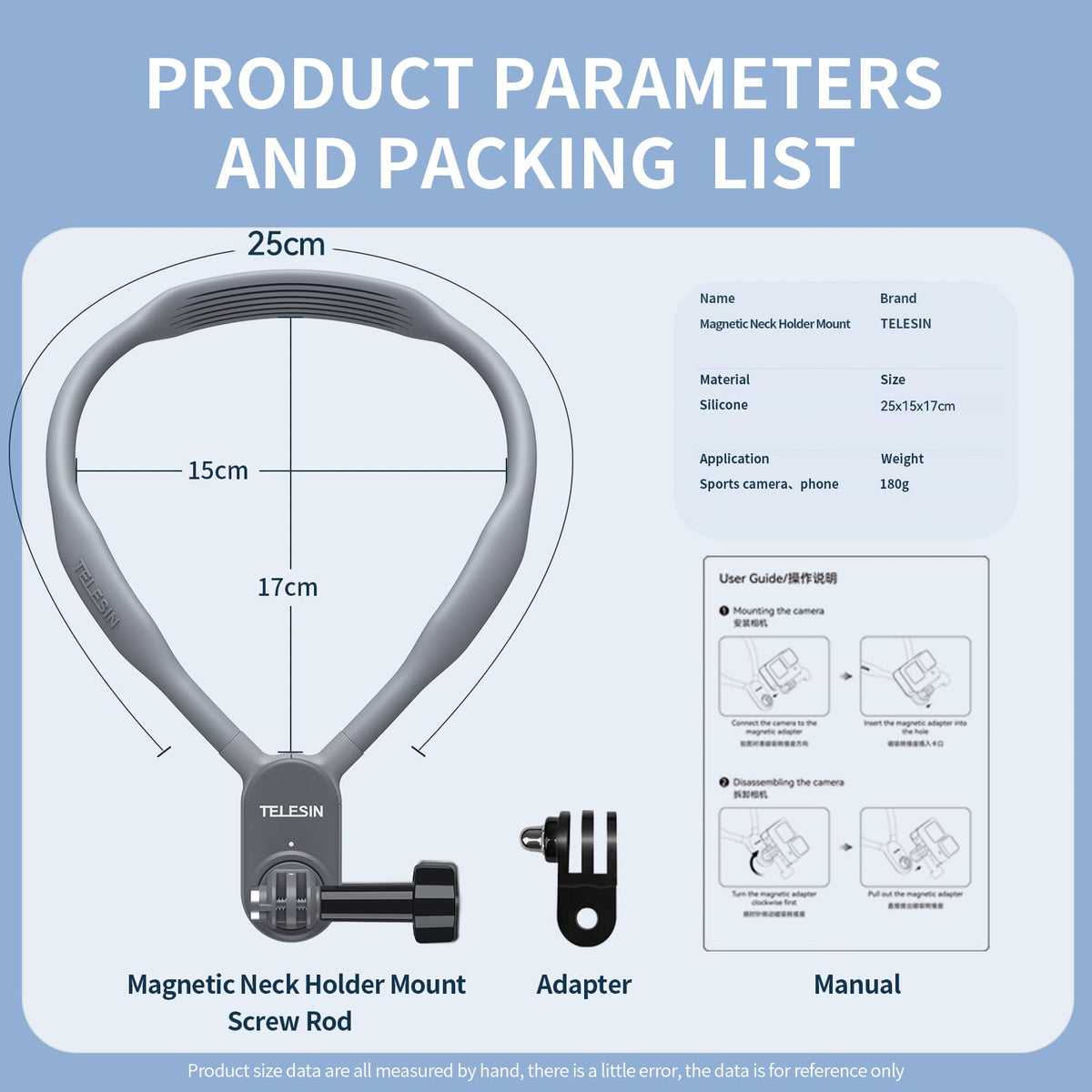 Telesin Magnetic Neck Holder Has A Larger Diameter (17Cm/6.7'), You Will Not Feel Tightened While Wearing. Only 0.4 Lbs Super Lightweight, Portable And Comfortable Both For Indoor And Outdoor Activities Use.