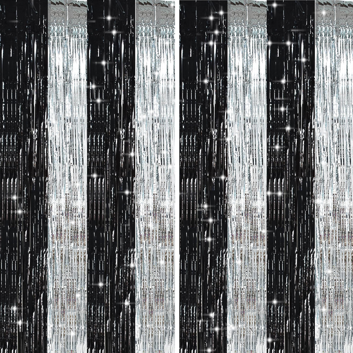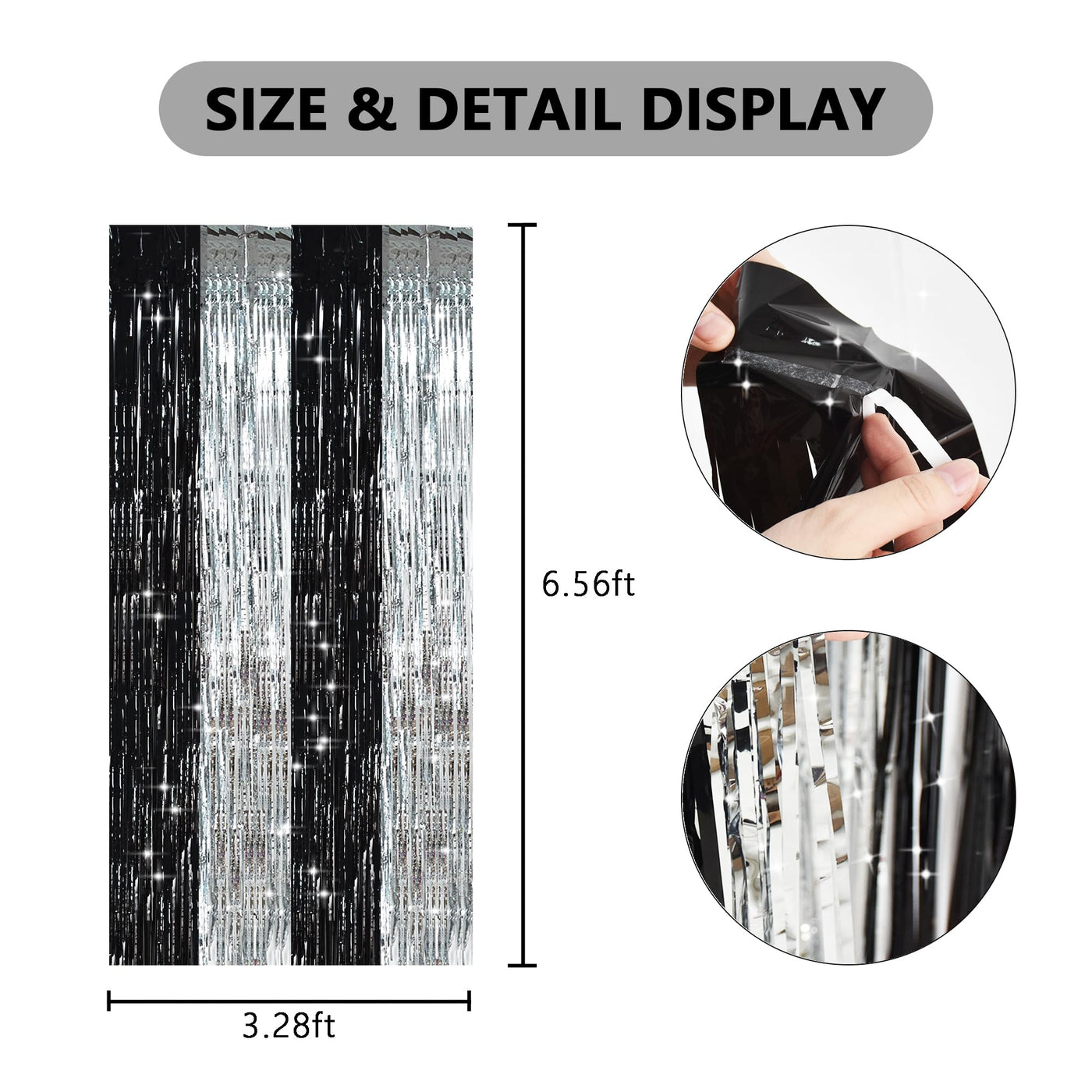 Toniful Silver Black Door Streamers,Silver And Black Photo Booth Backdrop Metallic Streamers Foil Fringe Curtain For Birthday,Ne