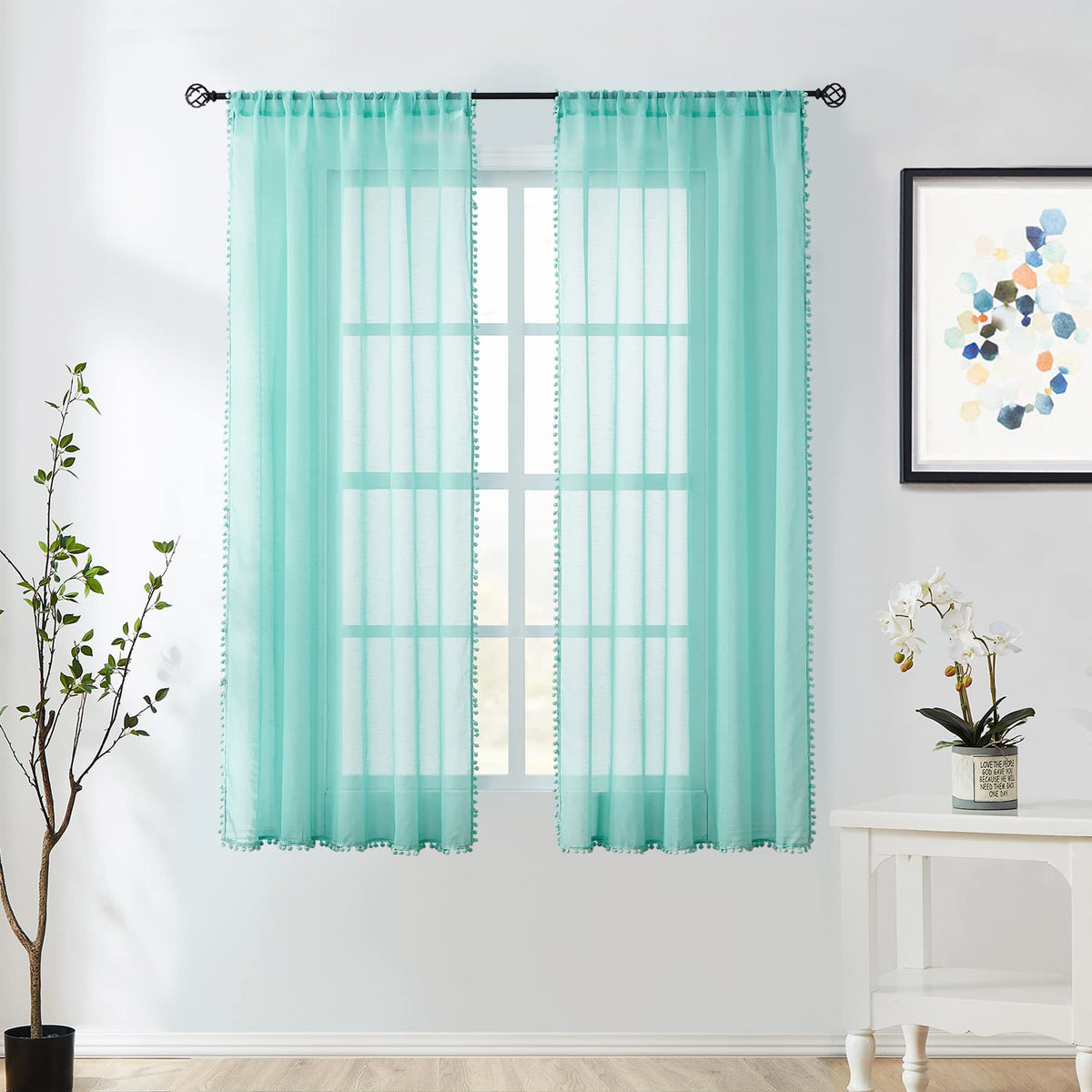Make A Splash In Your Space? The Graceful Aqua Sheer Curtains Are Highlighted With Pom-Poms For A Pop Of Personality You Are Sure To Adore. ??? Make It Fun & Cheerful: Featuring A Matching Pom Pom Border On Each Side That Instantly Captures Attention In Your Living Room, Bedroom Adding Another Touch To The Richness And Luxury Of Your Decor It Will Drape Beautifully Alone Or Over An Existing Blind With A Perfect Finishing Touch ??? Get Sun-Filled Rooms: Crafted From Subtly Textured Fabric, This Sheer Aqua Curtain Adds A Luxe, Lightweight Texture To Any Room. These Classic Aqua Window Drapes Gently Diffuse Light, Thus Create An Ethereal Ambiance. See-Through Curtains Are Designed To Let Fresh Air Through And The Perfect Amount Of Light Splash Into Your Home ??? Durable Sheer Window Curtains: Color: Aqua Sheer Curtains Size: 52''W X 63''L/Panel, 104''W X 63''L/Panel Package: Valued 2 Panel Draperies Header Type: 3 Rod Pocket Curtain Set ??? Care Instrustion: Material: Soft Yet Durable Polyester Fabric Cleaning Method: Machine Washable