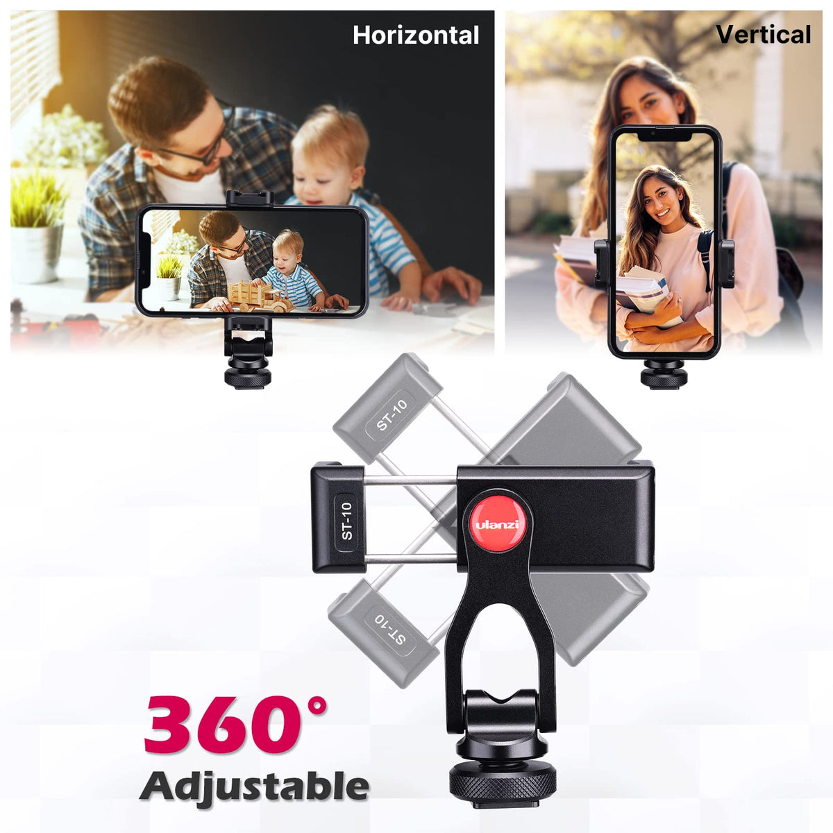 ?High Quality? The St-10 Phone Holder Is Made Of Aluminum Alloy, Durable And Sturdy. It Would Hold The Phone, Even The Mic And Light Together Without Shaking ?2 Cold Shoe Design? The Phone Tripod Holder Allows To Mount The Mic And Led Video Light At The Same Time, Ideal Accessory For Iphone Vlog; 360Rotating Design, Supports Horizontal And Vertical Shooting Angles, Work With Tiktok Mode ?Attached With Hot Shoe? The Phone Holder Has A Hot Shoe, Enable To Mount On Camera As Monitor Directly, Compatible With Sony Canon Nikon Cameras Dji Roin S/Sc/Rs Zhiyun Crane Gimbals ?Compact And Lightweight? The Cell Phone Holder Is Only 51G, 105Mm/4.13In, Very Portable, So Mini That Easy To Take Out And Put It Into Any Bag Even Pocket ?Phone Protection? There Is Silicon Pad Inside The Phone Clip, Enhance Holding Sturdiness And Protect Phone From Scratching ?Widely Compatible? The Phone Holder Width Ranges From 2.2 - 3.15In, Fit 99 % Phones In The Market, Compatible With For Iphone 12 11 Pro Max X Xr Xs Max 8 7 Plus Samsung Galaxy S10 S9 Note10 Google