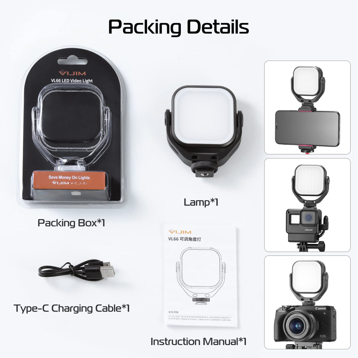 66 Beads Fill Light With Softbox: The Vl-66 Led Video Portable Light Comes With 66 Beads, Cri95 + 2500K-6500K, Brighter, Bigger Angle. Softbox Design, Not Dazzlingwarm Light And White Light Adjustable: This Led Video Light Can Be Adjusted Quickly According To The Change Of Application Scenario. Built-In Lithium Battery Type-C Interface Charging2000Mah Large Capacity Battery:2000Mah Built-In Lithium Battery: Charging Time Is 2 Hours, Maximum Brightness Output Is Up To?? 600?? Minutes, Minimum Brightness Output Is Up To 300?? Minutesshooting Lighting Vlog Video Light: Compatible With Sony A6300/A6400/A6500/A6600, Canon, Nikon, Dji Osmo Pocket/Osmo Action/Osmo Mobile 2 3 Zhiyun Smooth 4 Q Gopro Hero 8 7 6 5 Max. Travel Record Life Record Youtube Video Selfie Food Photography Live Broadcast Tiktok For Filmmaking Youtube