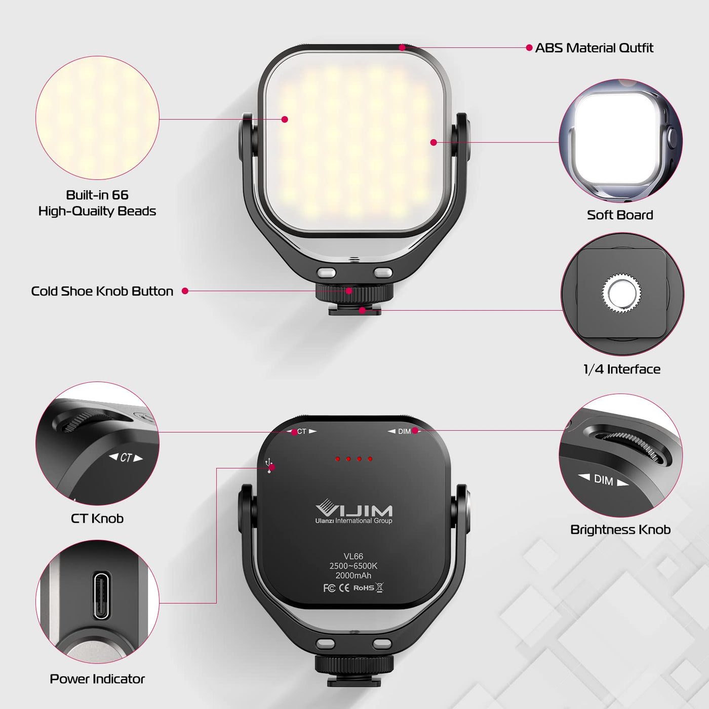 Ulanzi Vl66 Bi Color Adjustable Rechargeable 2500 6500K Mini Video Portable Light On Camera, 2000Mah Cri95+ Dimmable, Ultra Br