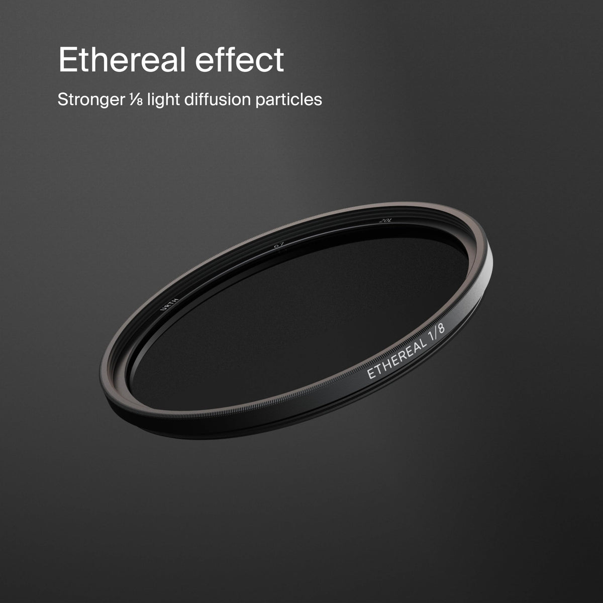 Q: What is the effect of using the Urth 49mm Ethereal ⅛ Diffusion Lens Filter?A: The Urth 49mm Ethereal ⅛ Diffusion Lens Filter creates a subtle haze effect that enhances contrast, making it ideal for capturing soft, cinematic images. It works particularly well with bright and close light sources.