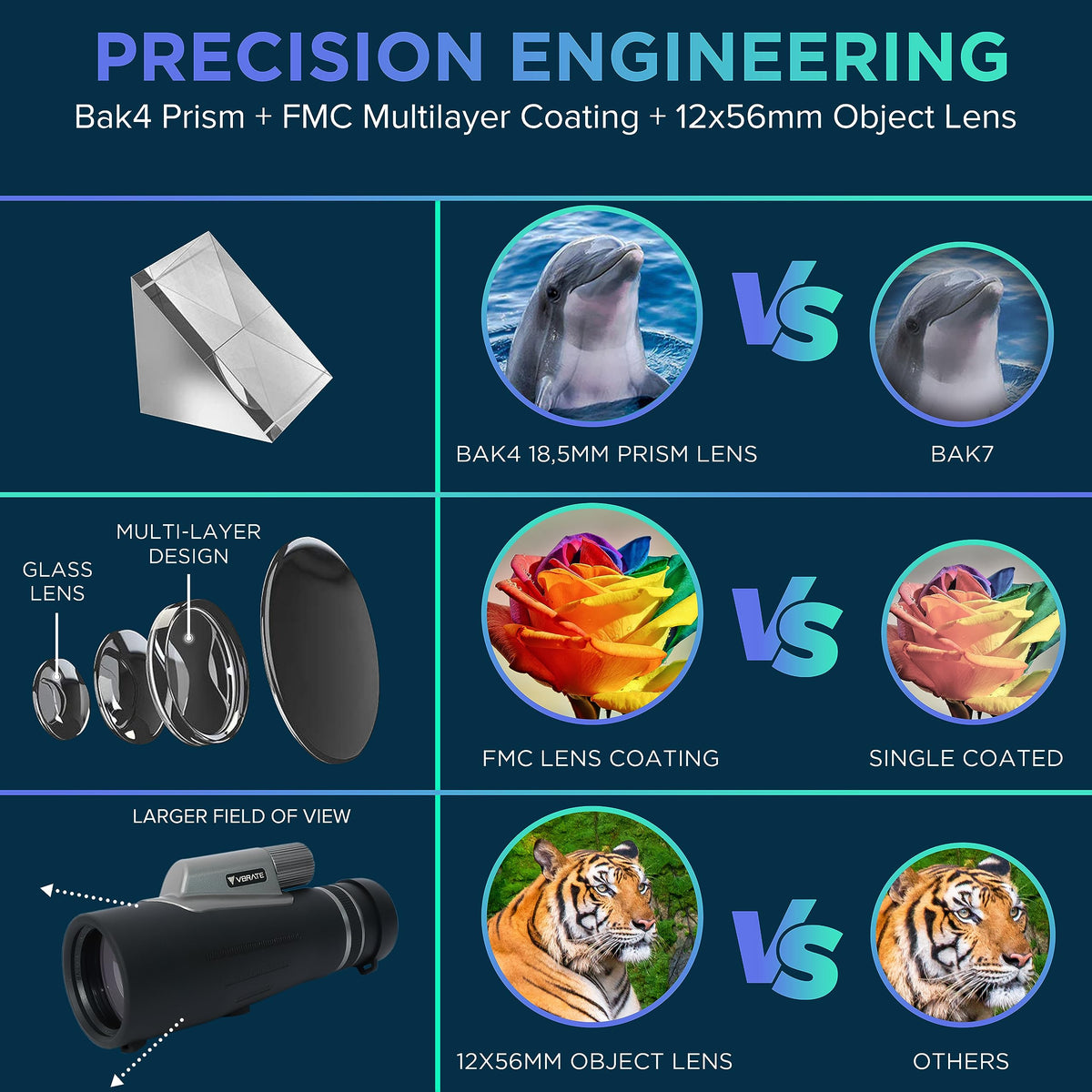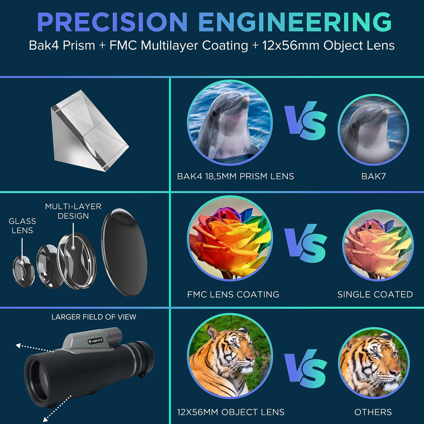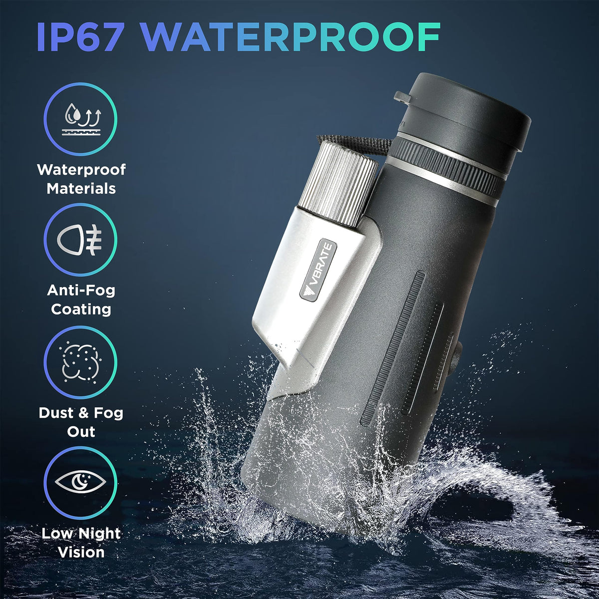 Vbrate Monocular Telescope 12X56 Telescope With Smartphone Adapter, Tripod Compact Monocular Scope With Low Light Night Visi