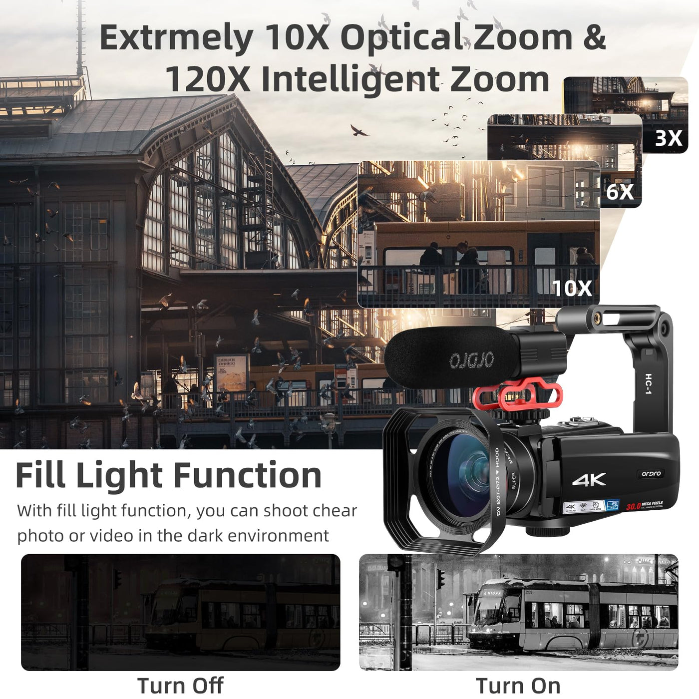 Video Camera 4K Camcorder With 10X Optical Zoom & 120X Intelligent Zoom, 4K 30Mp Wifi Youtube Video Streaming Camera 3.0' Ips Touch Screen Digital Camera With Microphone, Wide Angle Lens, 32G Card