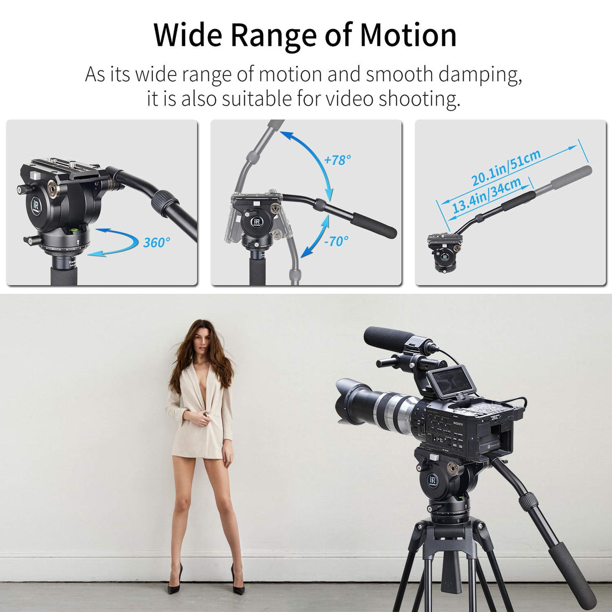 Video Head Features: Hard Anodic Oxidation, All Cnc Technology, Super Smooth Damping; Most Advanced Technologies Are Applied, Top Quality, Heavy Duty; Large Size, All Metal Lock And Stainless Steel Gear, Sturdy And Durable; Handle Length Can Be Adjusted From 13.4In (34Cm) To 20.1In (51Cm); Safe Button Prevents The Equipment Falling Off Accidentally.