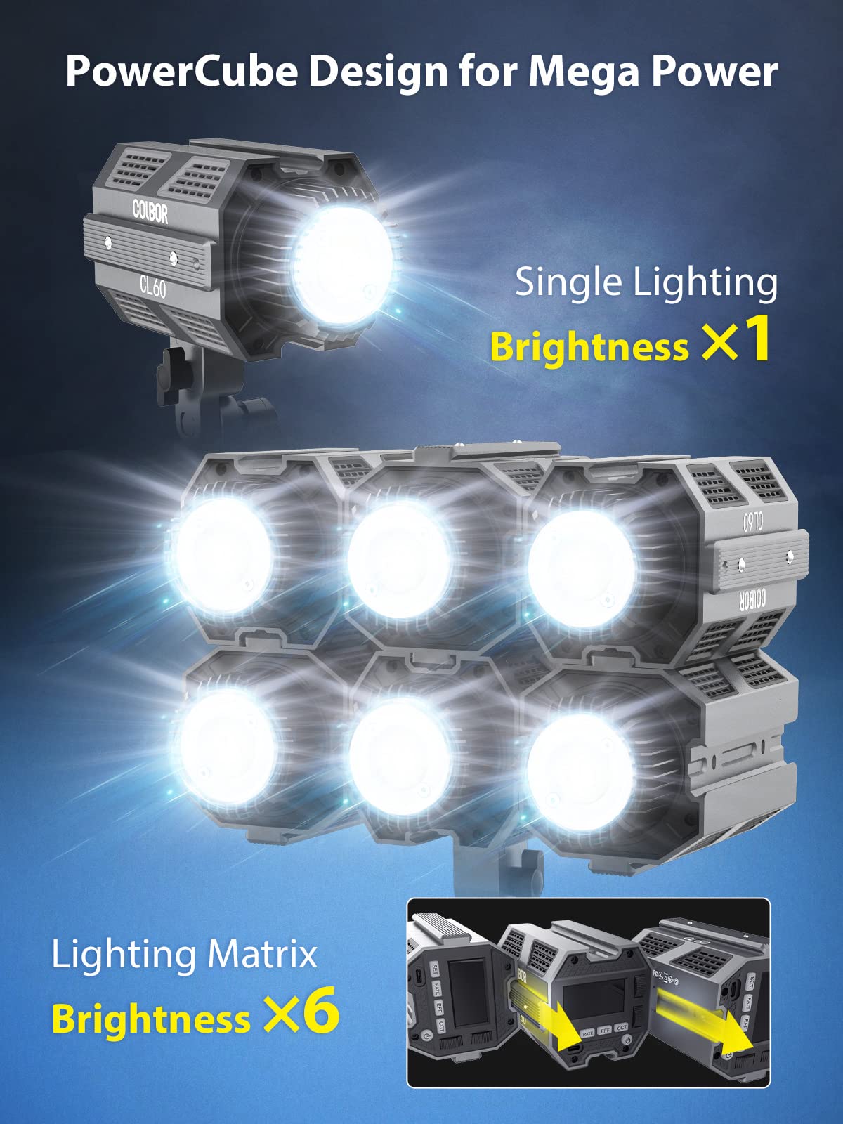 The Colbor Cl60 Is A Led Light For Video Shooting That Can Create Mega Power By Powercube Design And Matrix Control. It Can Be Integrated And Controlled Remotely By One Unit Or Via Colbor Studio App From A Distance. It Is The First 65W Cob Light In The Market That Supports Pd Power Bank. Moreover, It Is Connectable With More Power Options And Is Applicable To More Scenes.