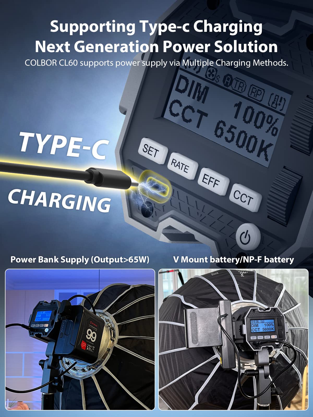 Q: What are the power options for the COLBOR CL60?A: The COLBOR CL60 supports Type-C charging and can be powered by PD power banks, PD adapters, and other sources like V mount batteries and NP-F batteries, providing flexible power solutions for outdoor shoots.