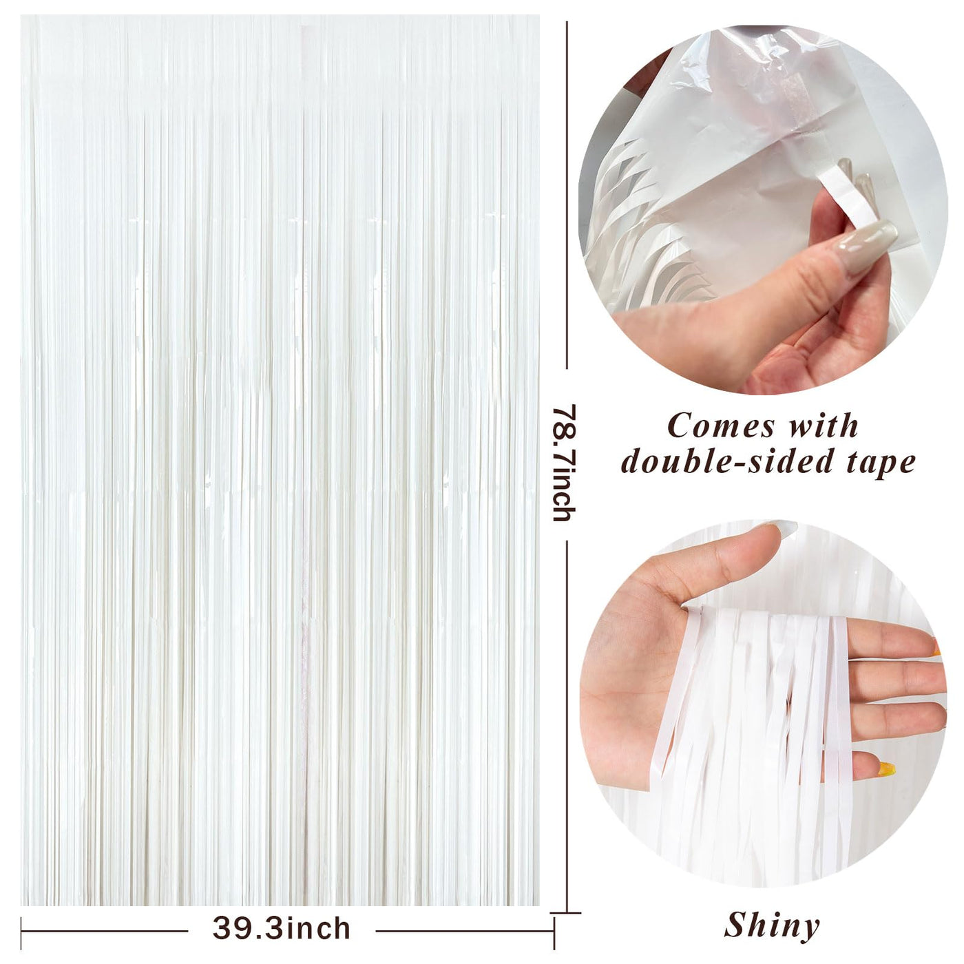 Q: What are the dimensions of the White Party Streamers Foil Fringe Backdrop Curtains?A: Each curtain measures 3.28 ft x 6.56 ft, providing ample coverage for your party decorations.