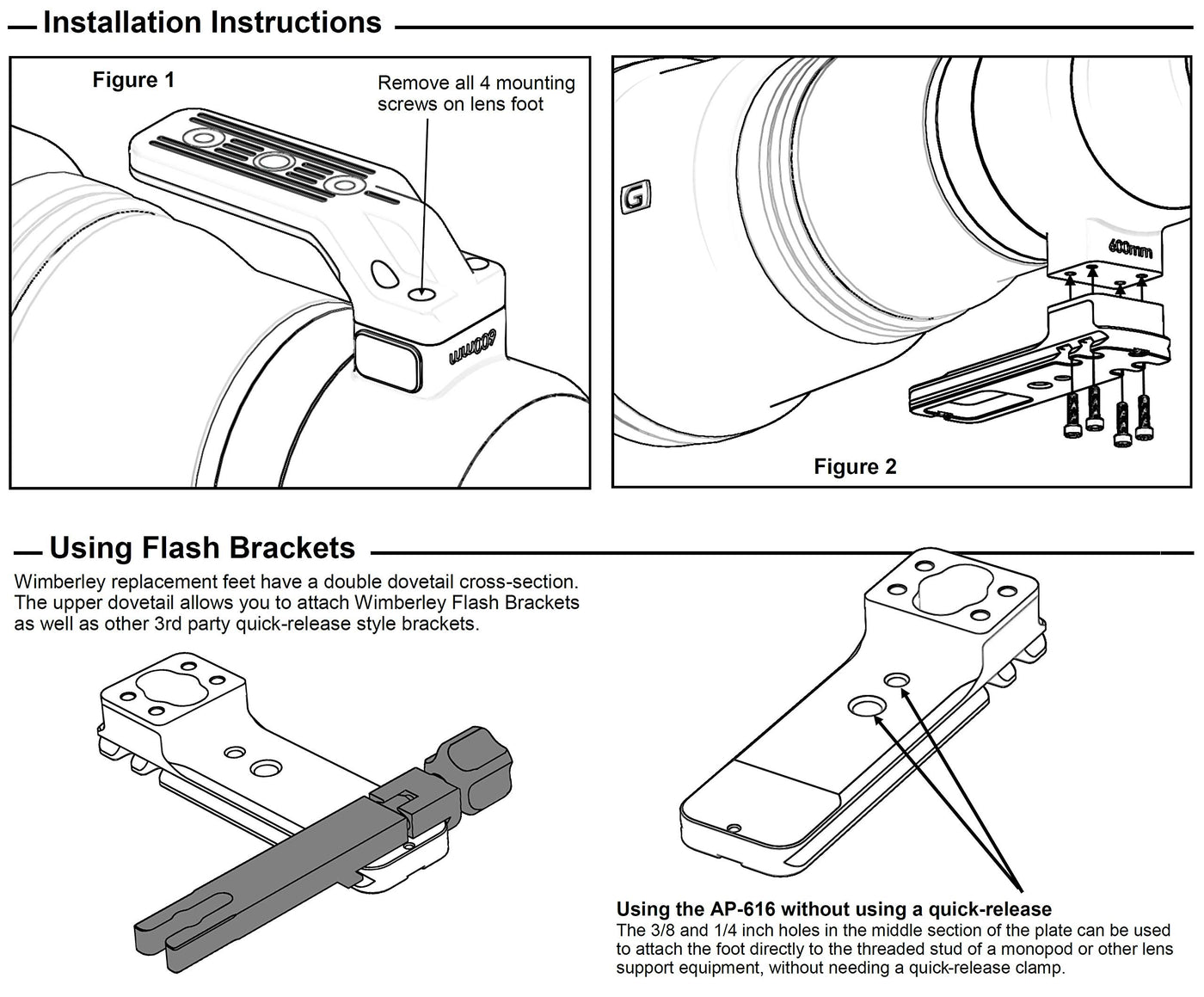 About The Ap-616 Replacement Lens Footthe Ap-616 Replaces The Stock Foot On Sony Lenses (See List Below, Image Of Compatibility Chart, Or Our Website). The Ap-616 Is Precision Machined To Slide Right Into An Arca-Swiss Style Quick-Release Clamp. It Also Has 1/4'' And 3/8'' Tapped Holes For Mounting To Non-Quick-Release Tripod Heads And Monopods. All Replacement Feet Feature The Same Dual Safety Stops And Flash Bracket Compatibility As Our Lens Plates. For Use On The Following Lenses Sony 600 F/4.0 Gm Oss Lenseswhat'S Includedap-616 Arca-Swiss Style Replacement Lens Foot (Qty 1) Mounting Screws - M4 X 12Mm Socket Head Cap Screw (Qty 4)Safety Stop Screws - M3 X 6Mm Socket Head Cap Screw (Qty 2)Hex Key - 3Mm T-Handle (Qty 1)Hex Key - 2.5Mm (Qty 1)10 Year Warranty On All Products From Wimberleyabout Wimberley Replacement Feetwe Use Finite Element Analysis Validated By Empirical Data When We Design Our Feet. This Process Allows Us To Optimize The Weight To Stiffness Ratio. Other Manufacturers Often Reduce Weight By Removing Material In Ways That Are Convenient For The Machining Process Or Aesthetic Design While Ignoring Stiffness Performance Resulting In Rigidity Below Our Quality Standards.Not Compatible With Most Manfrotto Or Gitzo Clamps
