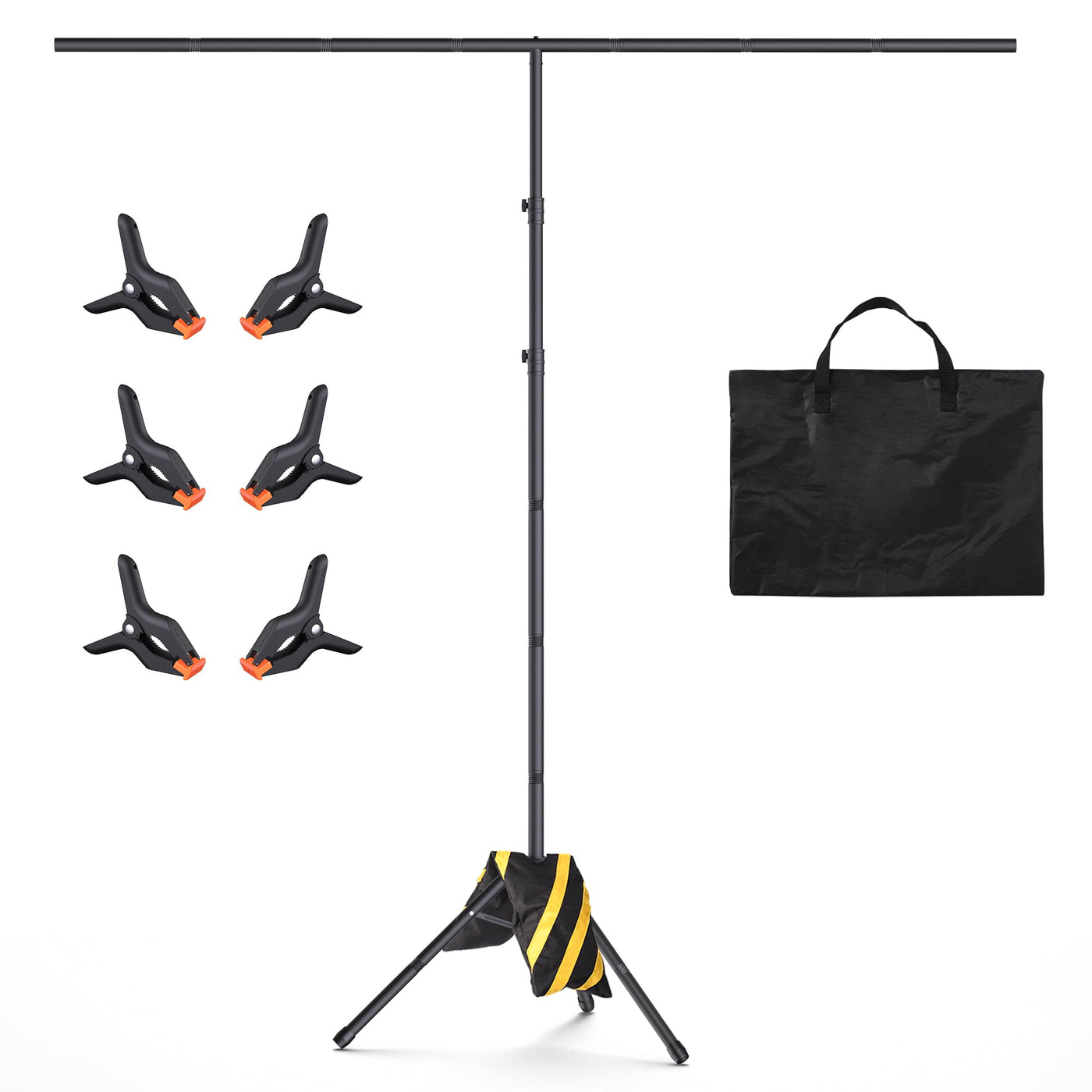 Q: How stable is the T-shape backdrop stand during use?A: The T-shape backdrop stand features a tripod design with two sections for enhanced stability. Additionally, sandbags can be used to further secure the stand, ensuring it remains stable during your photography sessions.