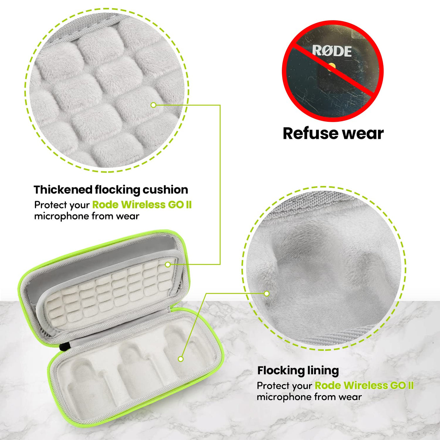 The mic bag lining is made of soft flocking material. Velvet-like Fabric and Tear-Resistant material, the sense of touch feel more comfortable. In addition, the case has a thickened flocking cushion with compartments, which can perfectly protect your Rode Wireless GO II microphone from being worn.