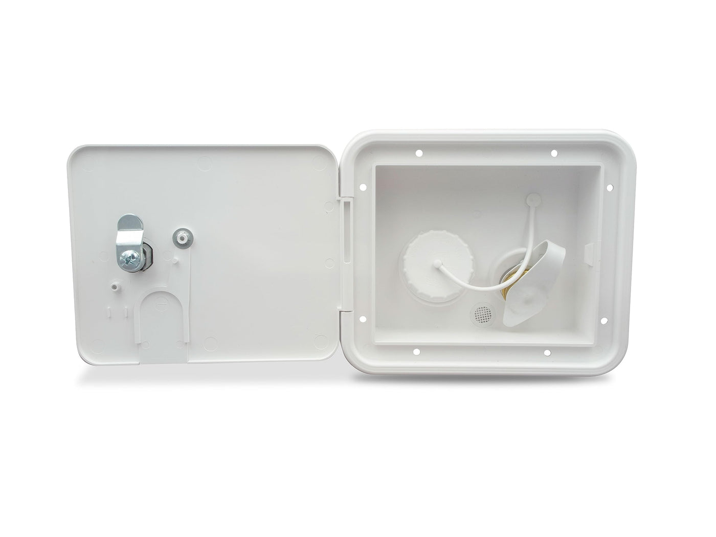 Guaranteed Not To Yellow Or Fade! Water Hatch Has Both A Gravity Water Spout And Cap For Filling The Fresh Water Tank And A City Water Fill For Connecting To A Water Faucet. Factory Tested For Zero Leakage. Comes With A Key Lock With A ''Global Pro'' Interchangeable Automotive Type Cylinder That Can Be Changed To Match Your Entry Door Lock Or Other Compartments.