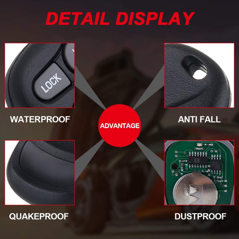 Replaces Part Number: Abo1502T, Ab01502T, 16245100-29, 16207901-5, 16245104, 16245102, 16245103, 16245105, 16245100Fit For: Chevy Blazer 1998-2001 Chevy S10 1998-2001 Chevy Silverado 1500 1999-2001 Chevy Silverado 1500 Hd 2001 For Chevrolet Silverado 2500 1999-2001 Chevy Silverado 2500 Hd 2001 Chevy Silverado 3500 2001 Chevy Suburban 1500 2000 2001 Chevy Suburban 2500 2000 2001Chevy Tahoe 2000 2001Gmc Sierra 1500 1999-2001Gmc Sierra 1500 Hd2001Gmc Sierra 25001999-2001Gmc Sierra 2500 Hd2001 Gmc Sierra 3500 2001 Gmc Sonoma 1998-2001 Gmc Yukon 1999-2001 Gmc Yukon Xl 1500 2000 2001Gmc Yukon Xl 2500 2000 2001Oldsmobile Bravada1998-2001Compatibility Please Use The Compatibility Chart Drop Down Menu Above To Double Check If These Will Work For Your Car.You Must Have A Factory Installed Keyless Entry System For These To Work.This Key Will Work For The Vehicles Listed In The Compatibility Chart Above.Your Existing Key Must Look The Same And Have The Same Button Configuration For This To Work Properly.Package Including 2New Replacement Remote Keyless