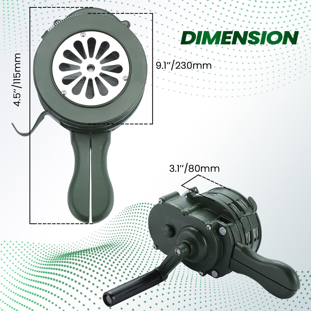Features: Handle And Cranking Lever Folds. No Power Supply Required. Compact For Portability. Powerful Universally Recognized Sound. Manual Hand Crank Operated Air Raid Siren. Produces A Loud Adjustable Sound Of 110 Decibels. Made Out Of Durable Aluminium Alloy. Ideal For Getting Peoples Attention, Or Rooting For Your Favorite Team In Sporting Events, And Many More Applications. By Manually Rotating The Handle, The Gearbox Of The Transmission Step By Step Acceleration To Achieve The Purpose Of Sound, The Sound Depends On The Rotation Speed Of The Handle. Specification: Material: Aluminium Alloy Operation: Manual Hand Lever Operated Color: Green Sound Output: 1102(Db) Audio Frequency: 55020(Hz) Transmission Distance: 1000(Fm) Dimensions Length: 115Mm/4.5'' Width: 202Mm/8'' Height: 9.1'' Operation Steps: 1 Grab The Grabbing Handle In Left Hand And Open The Air Door (Adjust The Air Door According To The Direction Of Motion To Control Volume Of The Sound); 2 Turn The Rocking Handle Clockwise With Right Hand Till You Hear The Sound Package Included: 1 X Air Raid Alarm