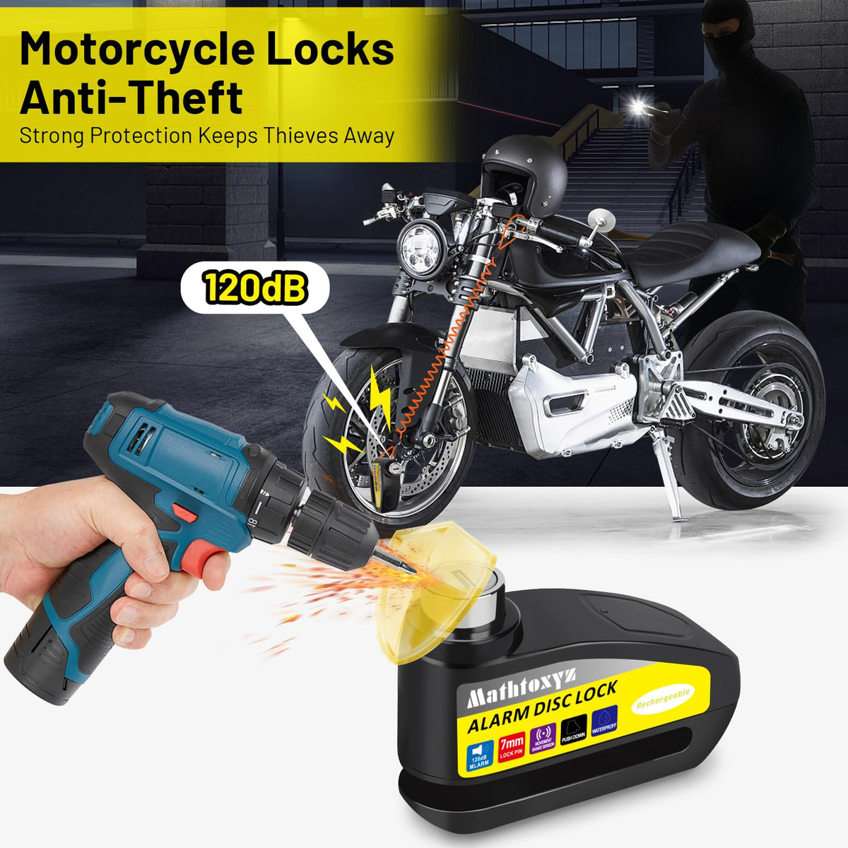 Motorcycle Lock Rechargeable, 120Db Alarm Disc Brake Locks Anti Theft Security Wheel Disc Lock Waterproof With 5Ft Reminder Cabl