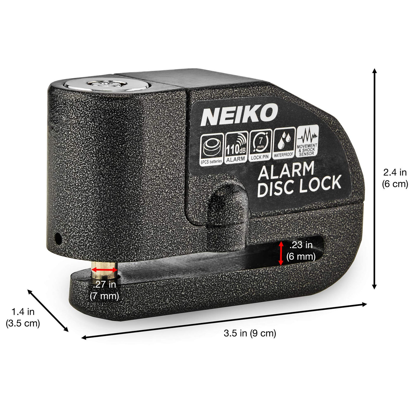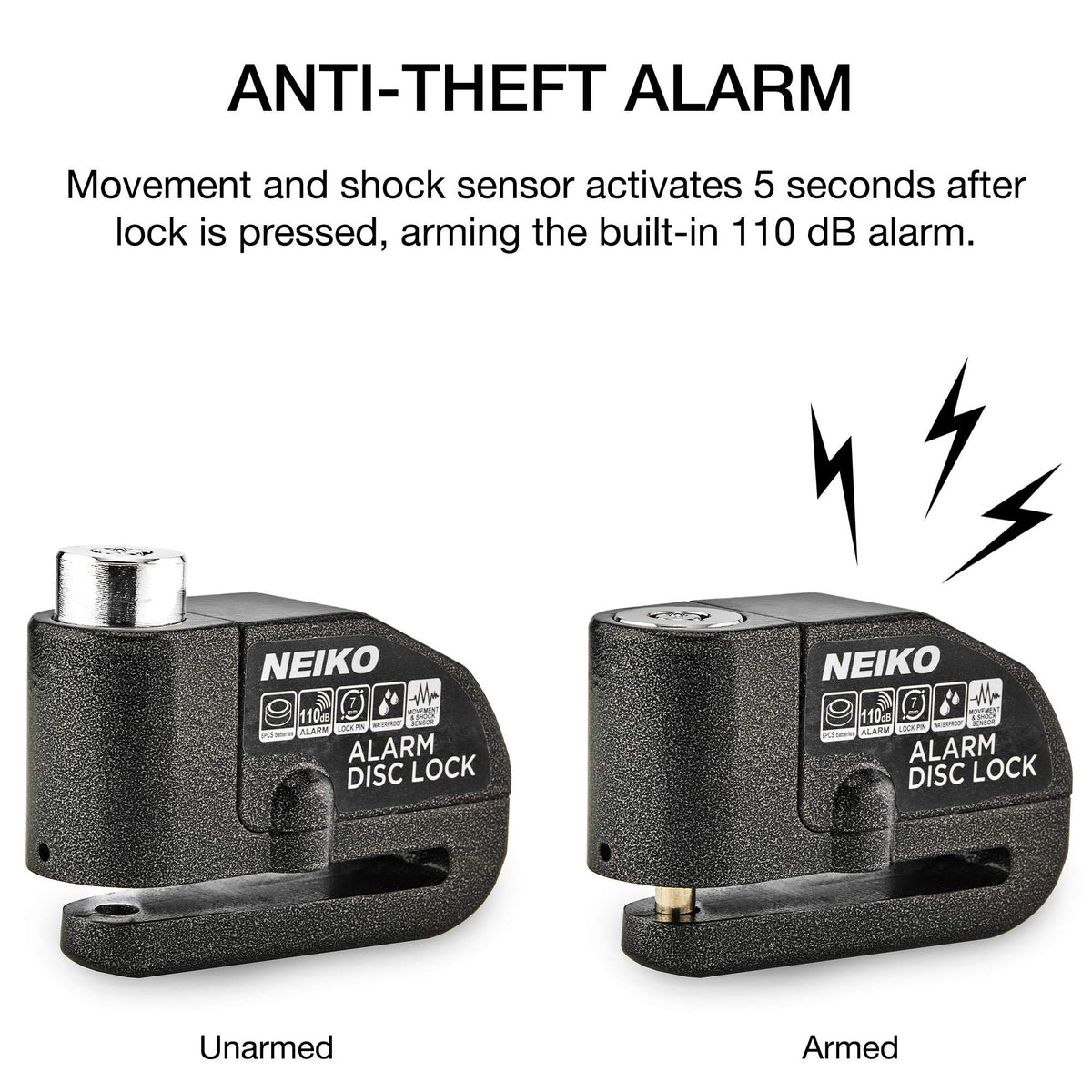 Descriptionneiko 52908A Motorcycle Wheel Disc Brake Lock With Alarm | Up To 110Db Sound Alarm | Anti-Theft Motion Sensor Security | Universal Brake Rotors Padlock For Motorcycles, Bicycles, Scooters, And More