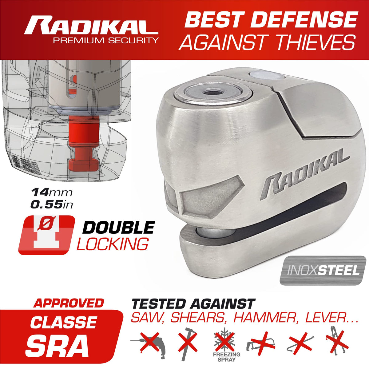 Radikal Rk14S Approved Alarm Disc Lock Motorcycle Premium Security, Hardened Stainless Steel Double Locking, Sek Disctech, High