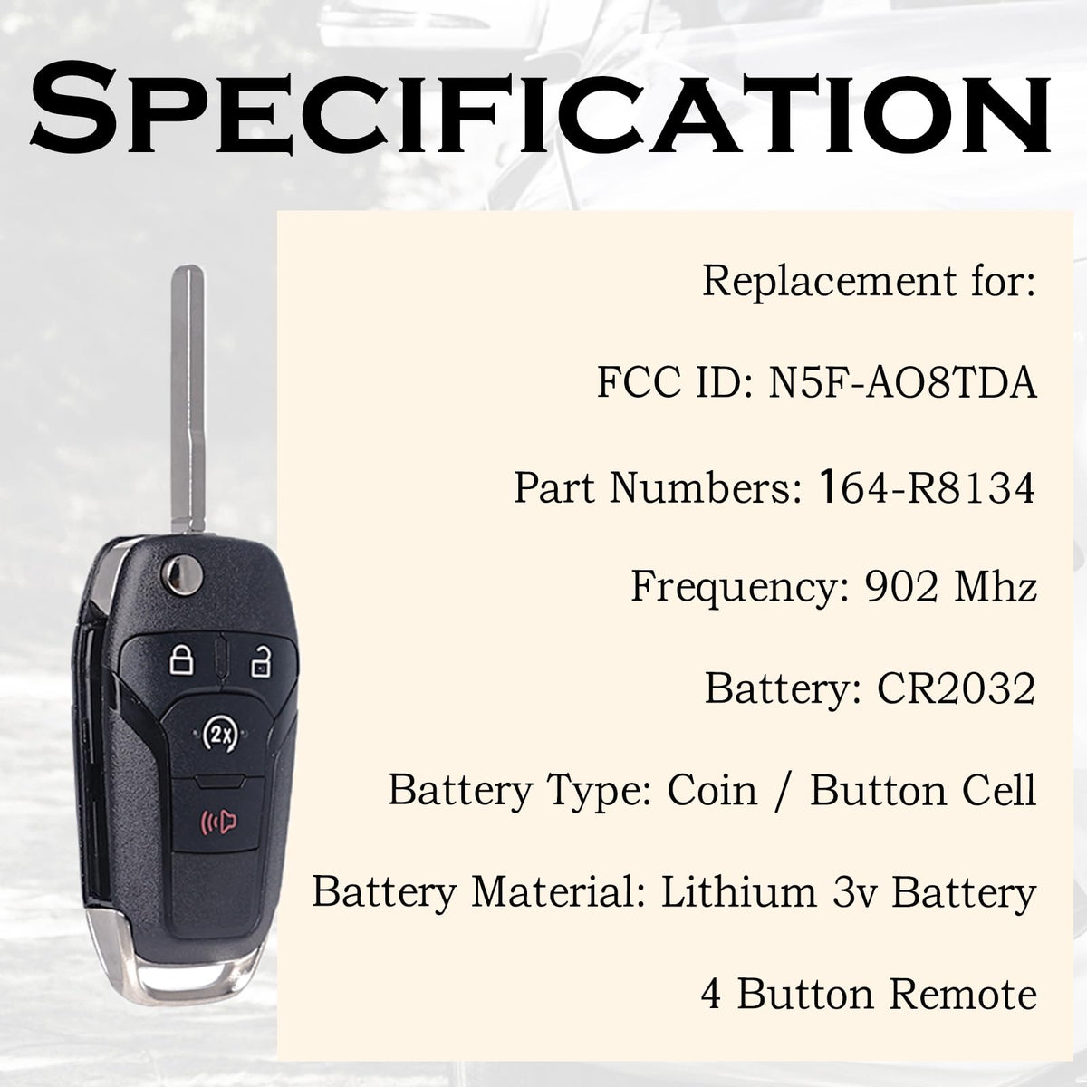 Note: This Is Aftermarket Remote Key Fob/Non-Oem, And It Doesnt Come With Logo Or Badge. Important Note: It Only Supports Regular Key Vehicles, It Doesnt Supports Push Start Button Vehicles. Will Not Work For Vehicles With Passive Entry (Also Called Peps, Push Button Ignition, Smart Key Or Proximity System) Compatible With Ford Models: 2021-2022 Bronco 2015-2024 F150 2017-2022 F250 F350 2017-2022 F450 F550 2019-2022 Ranger Replacement For: Fcc Id: N5F-Ao8Tda Part Numbers: 164-R8134 Programming: Qualified Locksmiths Or Dealership Are Required For Programming. Self-Programming Is Not Available. Frequency: 902 Mhz Battery Type: Coin / Button Cell Battery Material: Lithium 3V Battery 4 Button Remote