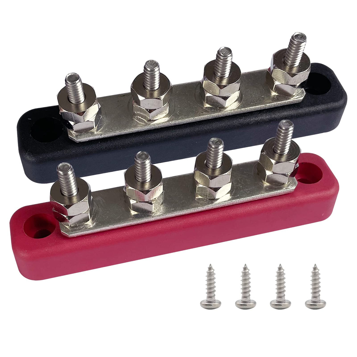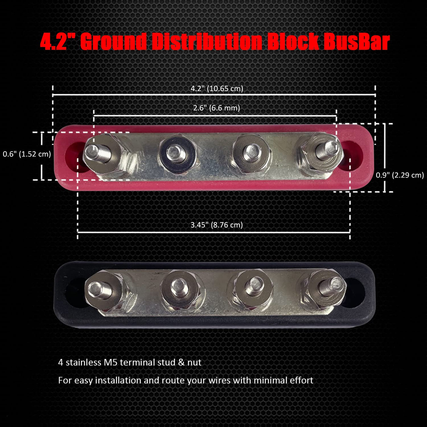 Ampper 4 Terminals 4.2'' Power / Ground Distribution Brass Battery Bus Bar Junction Block. Specifications: 1, Nickle Plated Brass Thick Busbar. 2, Base Is Made Of Heavy Abs, Mechanically Strong, Insulated, Heat Resistant And Flame Resistant, Durable Made For Safety Use. 3, 4 Stainless M5 Terminal Stud. 4, Used For Easy Installation And Route Your Wires With Minimal Effort. 5, Max Operating Voltage 48V Dc / 300V Ac. 6, Max Continuous Amperage: 150A Ac / 200A Dc. 7, This Brass Battery Bus Bar Junction Block Is Widely Used For Car, Vehicle, Rv, Truck, Marine And Boat, Audio, Amplifier, Video, Also Electrical Equipment / Appliances. Complete Kits Includes: 2 Pcs Bus Bar With 4 Stud And Nut
