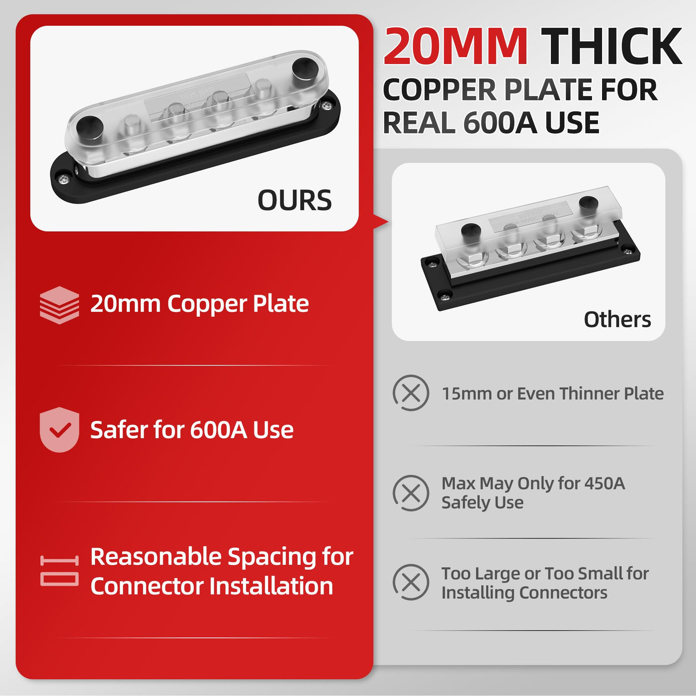 Q: How does the material of the DAIERTEK bus bar contribute to its performance?A: The DAIERTEK bus bar is made with a 20MM thick tin-plated copper contact plate, stainless steel terminals, and a polycarbonate base, providing enhanced durability and safety for high-current applications.