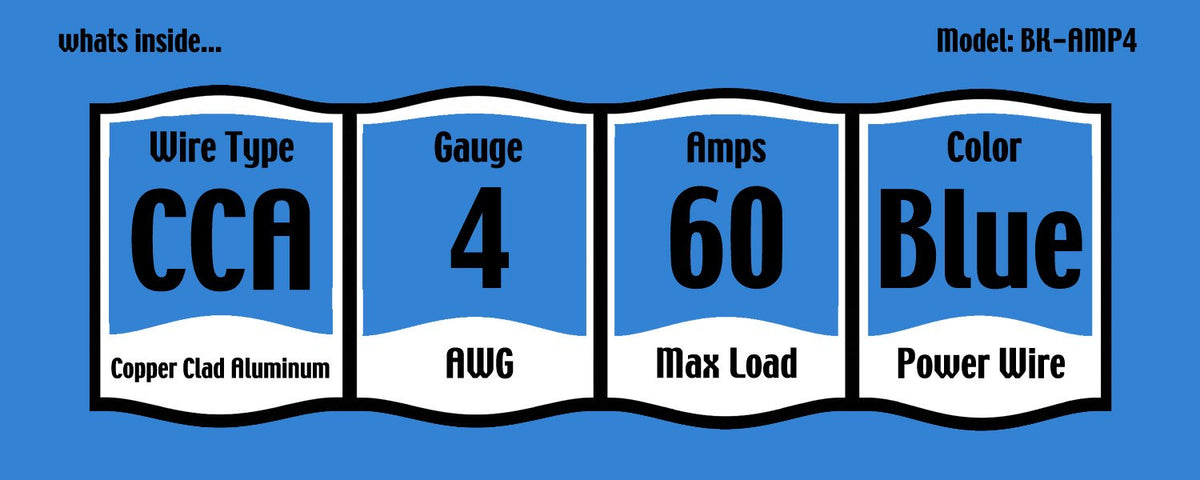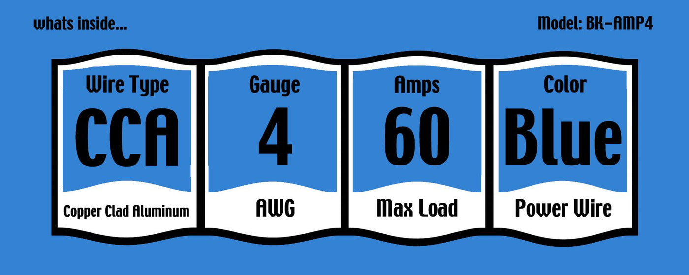 -16.5 Feet 4 Gauge Blue Bassik Power Wire -3 Feet 4 Gauge Black Bassik Ground Wire -One Waterproof Inline Fuse Holder With 60A Fuse -One 5 Meter Bassik Twisted Pair Rca Cable -20 Feet Black Bassik 16 Gauge Speaker Wire -2 Gold Plated 4 Gauge Ring Terminals & 2 Gold Plated Spade Terminals