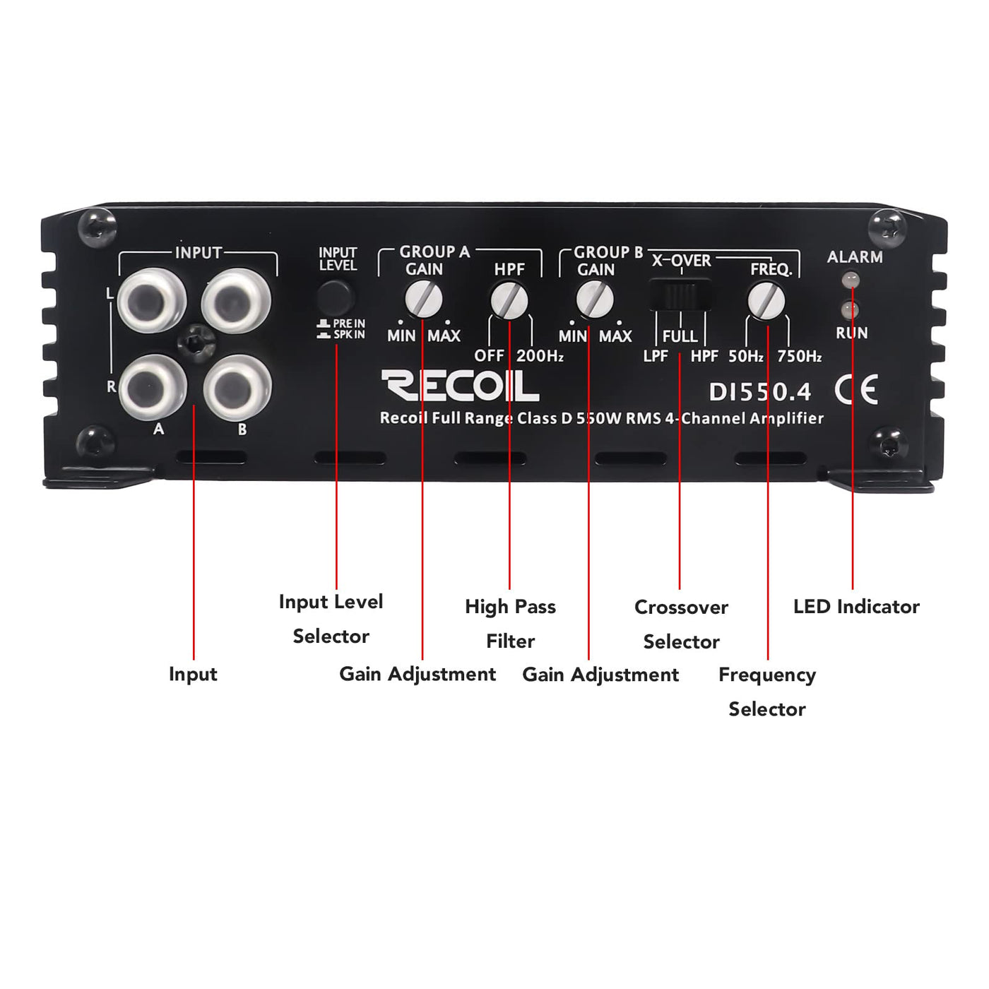 Recoils Di550.4 Is A Powerful, Efficient, And Highly Reliable Four Channel Class-D Full-Range Car Amplifier. Capable Of Powering An Entire Aftermarket Upgraded Speaker System In A Vehicle, It Packs The Power That Will Allow You To Get Loud And Let Your Speakers Come Alive. Featuring A High-Speed Mosfet Power Supply, Premium Grade Internal Components, As Well As 4-Way Protection Circuitry, The Amplifier Will Safely Operate At The Highest Levels Of Performance For Hours On End.