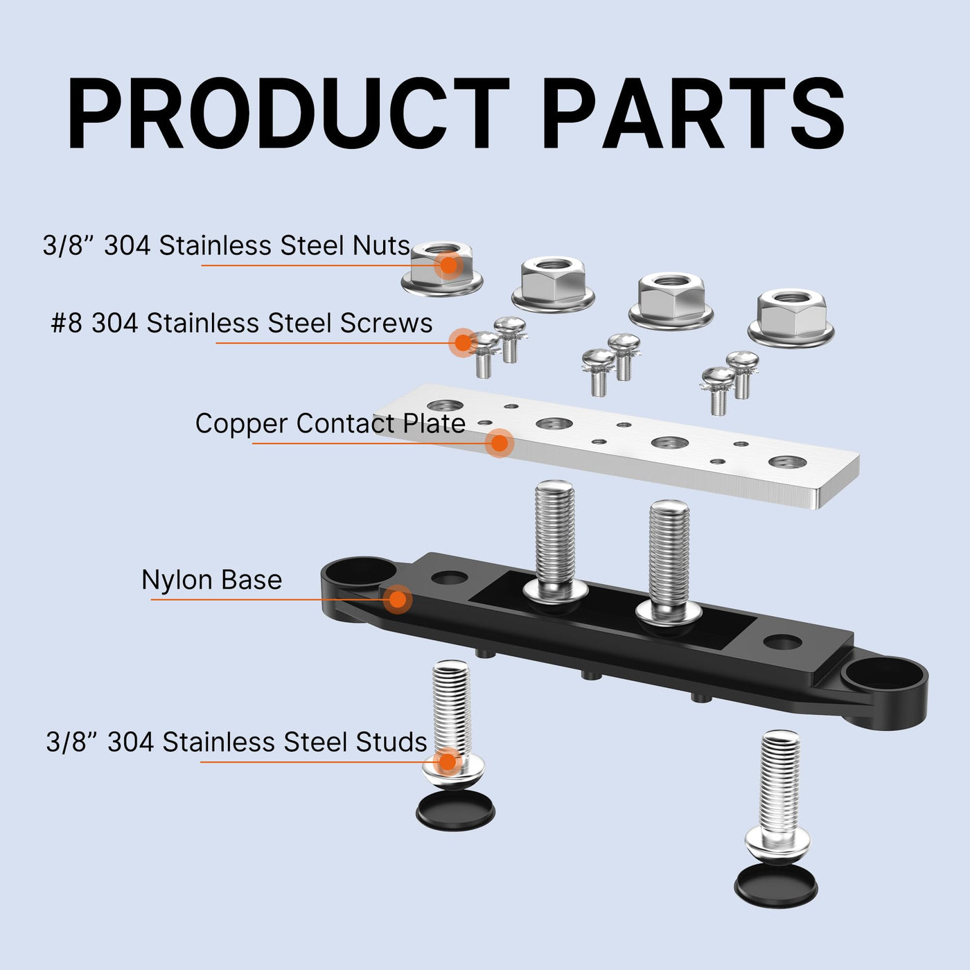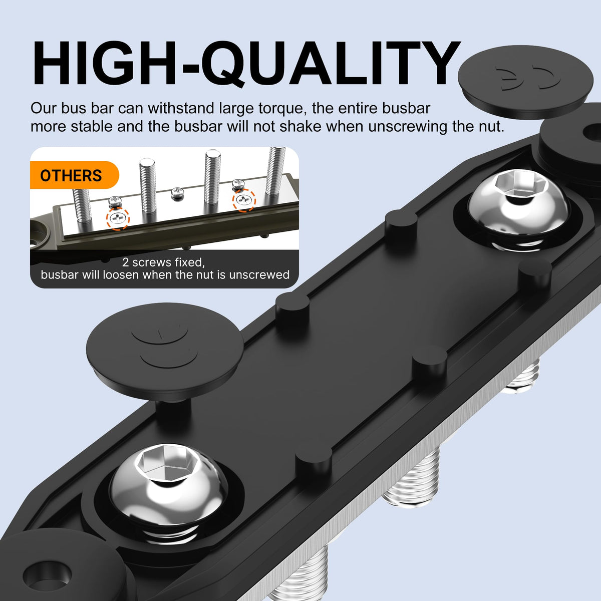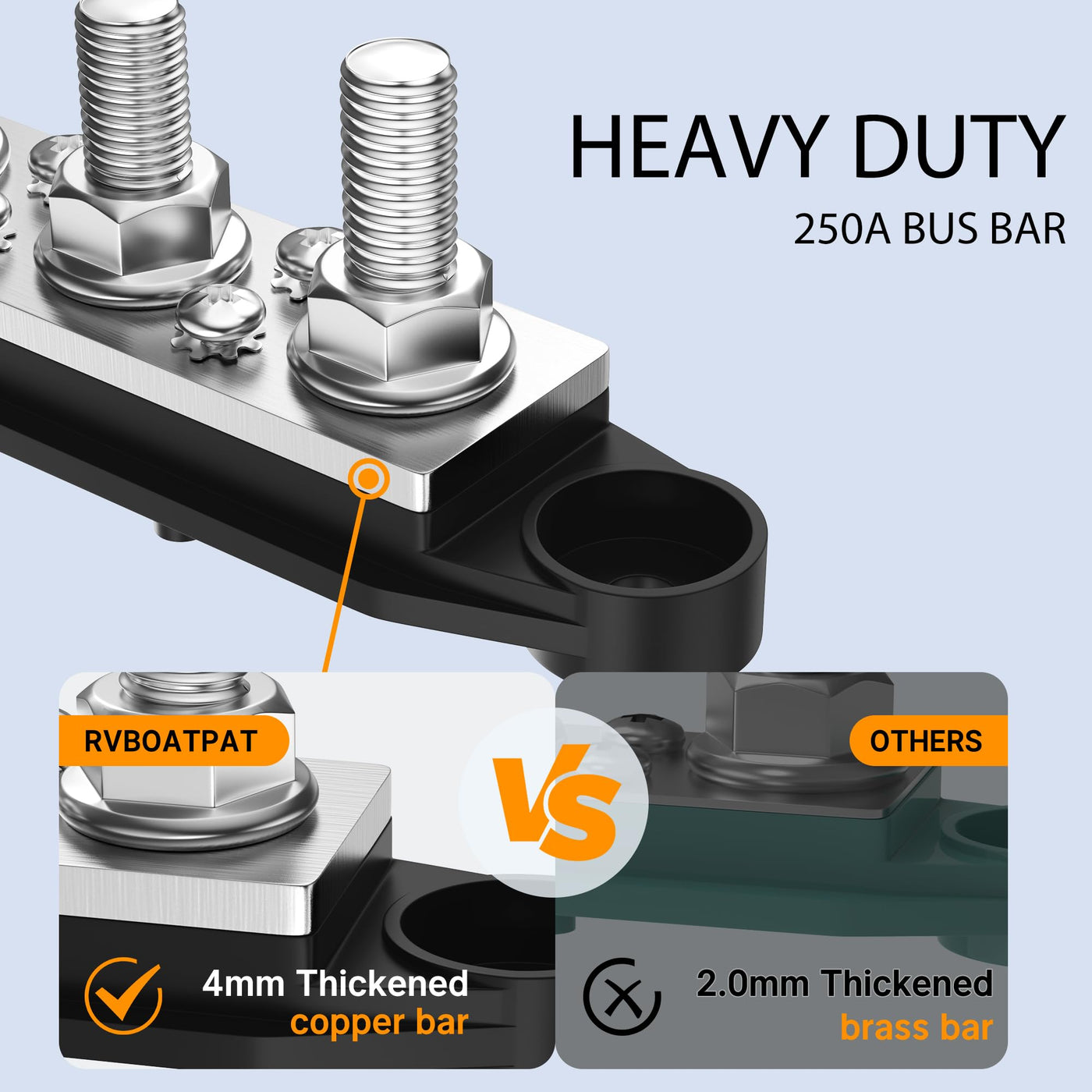 Heavy Duty: Power Distribution Block Can Deal With 250 Amp Continuous Amperage At Max 300V Ac Or 48V Dc Voltage. The 3.5Mm Copper Bar Is Thicker Than Others' 2.0Mm Brass Busbar And Can Withstand An Actual Current Of 275A.Product Information: A Pair Of 12V Bus Bar (Red And Black) With Screw: 6 X #8, Terminal Stud: 4 X 3/8 ''(M10). All The Terminals Of Our Bus Bars Are Made Of 304 Stainless Steel, Which Will Be Less Prone To Rust Compared To Other Busbar' Iron Termianl And Can Be Used For A Longer Time.Upgrade Design: The Special Fixing Method Of Our Marine Bus Bar And Base Can Withstand Large Torque, The Entire Busbar More Stable And The Busbar Will Not Shake When Unscrewing The Nut. The Busbar Fixing Method Of Others 'Is Not Very Firm, And The Entire Busbar Will Loosen When The Nut Is Unscrewed.Protect Cover: The Busbar Cover Can Cover Exposed Areas To Prevent Accidental Short Circuits. The Exposed Areas On Both Sides Allow Multi-Angle Installations, Which Can Meet Various Connection Methods.Wide Application: Using A Pair Of Black And Red Battery Bus Bar For Wire Management And Wiring Can Keep The Circuit Neat And Orderly, Reducing The Possibility Of Short Circuits. Suitable For Cars, Trucks, Caravans, Ships And Yachts, Etc.