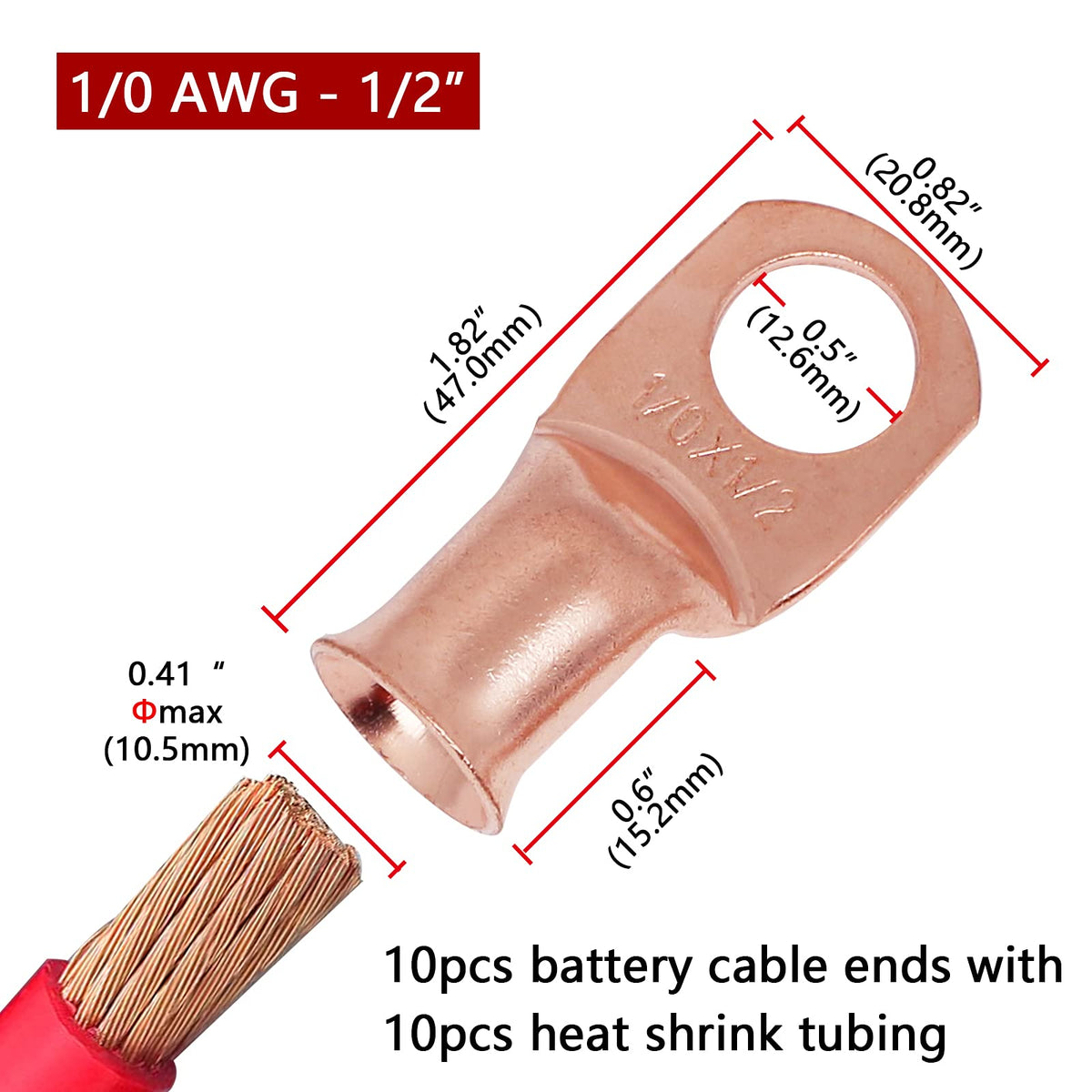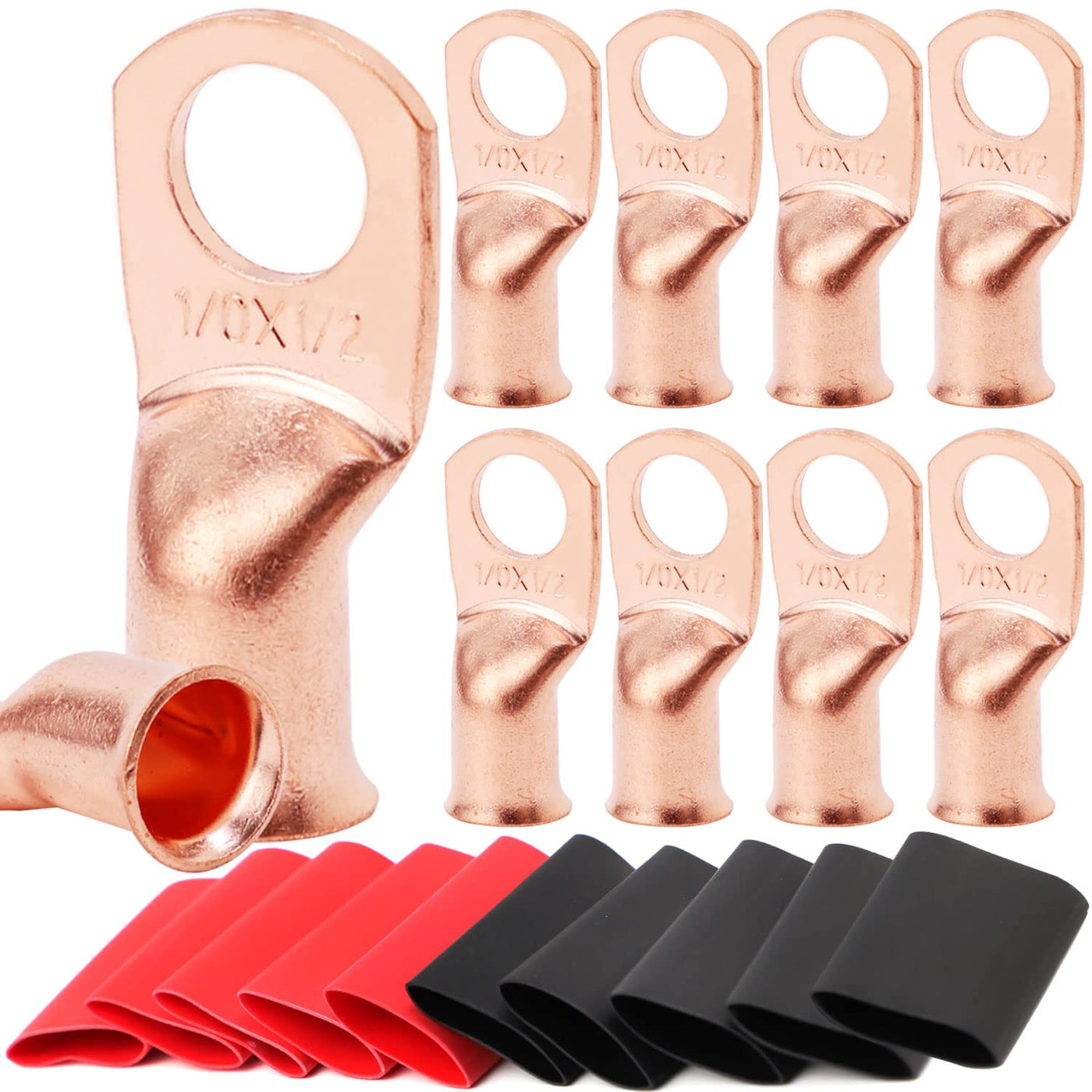 Tkdmr 10Pcs 1/0 Awg 1/2'' Battery Lugs,Copper Wire Lugs,Heavy Duty Battery Cable Ends,Tubular Ring Terminals,Awg Crimp Wire Ring