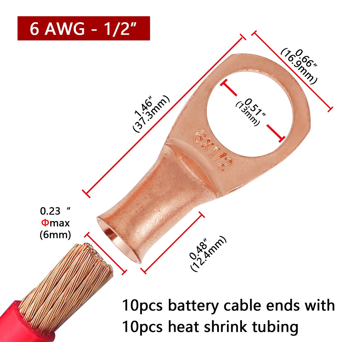 Tkdmr 10Pcs 6 Awg-12 Battery Lugs,Copper Wire Lugs,Heavy Duty Battery Cable Ends,Tubular Ring Terminals,Awg Crimp Wire Ring Lugs,Battery Terminal Connectors With 3:1 Heat Shrink Tubing Specification: Item Name: Battery Cable Lugs Material: Bare Copper Package Includes: 10Pcs * Battery Terminal Lugs 10Pcs * Heat Shrink Tubing(5Pcs Black,5Pcs Red) These Pure Copper Perforated Tubular Ring Ears Have Good Conductivity And Stability Comes With 3: 1 Heat-Shrinkable Tube Accessories, Convenient To Usesave Money The Wire Gauge Identification Mark Is On The Lug, Suitable For Standard Size Awg Cable ,Various Types Of Wire Gauges To Choose Ring Terminal Lugs Are Designed With Closed End Pads, Which Protect The Electrical Components, Batteries And Cables From Moisture, And Also Prevent Solder Leakage During Installation Awg Lugs Can Be Crimped Or Soldered From The End Of Your Awg Wire By Installation Tools Best Customer Service: If You Have Any Problems Concerning The Product, Please Contact Us As Soon As Possible, You Will Get A Reply Within 9 Hours,We Absolutely Provide Fast Response And The Best Customer Support , Buy With Confidence