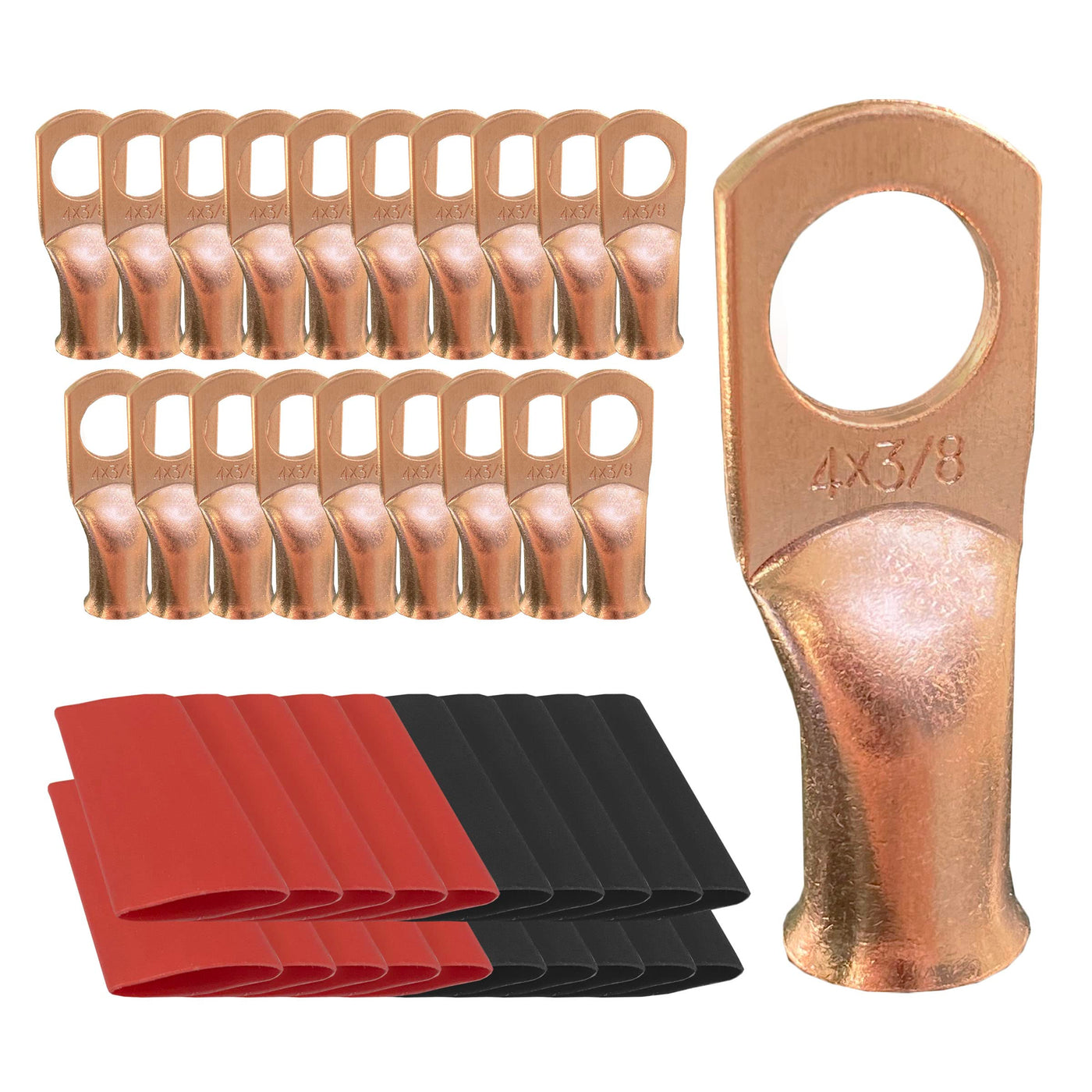 Q: What are the specifications of the 10pcs 4 AWG-3/8 Ring Battery Lugs?A: The 10pcs 4 AWG-3/8 Ring Battery Lugs are made from 100% annealed copper, ensuring high conductivity and corrosion resistance. Each lug is designed for 4 gauge wire and features a 3/8" (M10) ring terminal. The package includes 10 lugs along with 3:1 dual wall adhesive waterproof heat shrink tubing for reliable insulation.