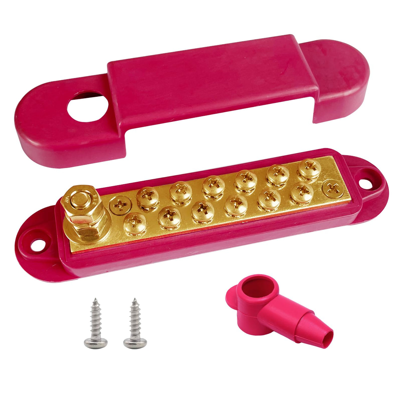 Ampper 12 Terminals 5.3 Power Distribution Brass Battery Bus Bar Junction Block. Specifications: 1, Brass Thick Busbar. 2, Base Is Made Of Heavy Abs, Mechanically Strong, Insulated, Heat Resistant And Flame Resistant, Durable Made For Safety Use. 3, 12 Stainless M4 Terminal Screws, 1 X 1/4 (M6) Stud Terminal And Nut. 4, Used For Easy Installation And Route Your Wires With Minimal Effort. 5, Max Operating Voltage 48V Dc / 300V Ac. 6, Max Continuous Amperage: 150A Ac / 200A Dc. 7, This Brass Battery Bus Bar Junction Block Is Widely Used For Car, Vehicle, Rv, Truck, Marine And Boat, Audio, Amplifier, Video, Also Electrical Equipment / Appliances. Complete Kits Includes: 1 Pcs Bus Bar With Cover, 12 Screws And 1 Stud Terminal & Nut