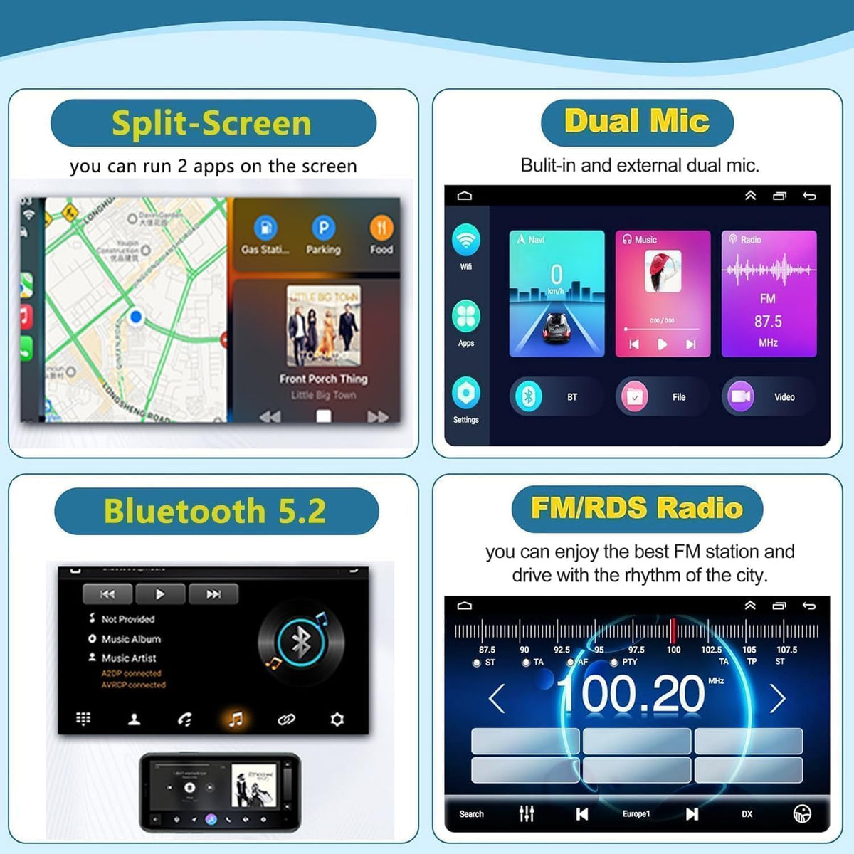Features 1. Android 12.0 Operating System 4G Ram & 64G Rom 2. Support Wireless/Wired Apple Carplay & Android Auto 3. Wifi Connect: Built-In Wifi Module, Can Connect To Internet By Wifi Hot Spot, Download App To Watch Online Video Etc 4. Gps Navigation: Built-In Navigation Module, Support On-Line Off-Line Navigation, Free Navigation Map 5. Bluetooth Function: Built-In Bluetooth Module, Support Bluetooth Phone Connect, Handsfree For Calling Or Bluetooth Music Play 6. Rear View Function: Support Rear View Camera Input, Backing Car More Safer And Convenient (Free Camera Come With Stereo) 7. Radio Tuning: Support Fm Radio, Fm1/Fm2/Fm3 87.5-108 Mhz, You Can Listen The Radio Which Is Your Interested. 8. Rear Dual Usb Port Input: Support Rear Cable Usb Input, Can Play Music/Movie Or Wire Carplay Android Auto 9. Screen: 2.5D Capacitive Touch Screen, 1024*600 Resolution, Support 1080P Video 10. Improve Sound Quality With Equalizer, Use Dsp Eq To Adjust The Sound To Render Better Results 11. Split Screen Function: You Can Use 2 App At The Same Time When You Use Split Screen Function If You Have Any Problem For The Radio Or Backup Camera When Using, We Provide Support For Fixing Your Issue. Specifics Voltage: Dc 12V, Not Support Car With 24V Operating System: Android 12.0 Apple Carplay: Support Wireless/Wired Connection Android Auto: Support Wireless/Wired Connection Ram: 4G Rom: 64G Screen Size: 10.26 Inch 2.5D Capacitive Touch Screen Bluetooth Version: 5.2 Usb: Dual Usb 3.0 Radio Band: Fm Audio Ouput: 4X50W Resolution: 1024*600Pixel Support 1080P Video Audio Format: Mp3 Mp2 Aac Ogg Flac Ape Wma Wav Rm Ac3 Video Format: Avi 3Gp/Mp4 Mov Mpg Mkv Wmv Rmvb