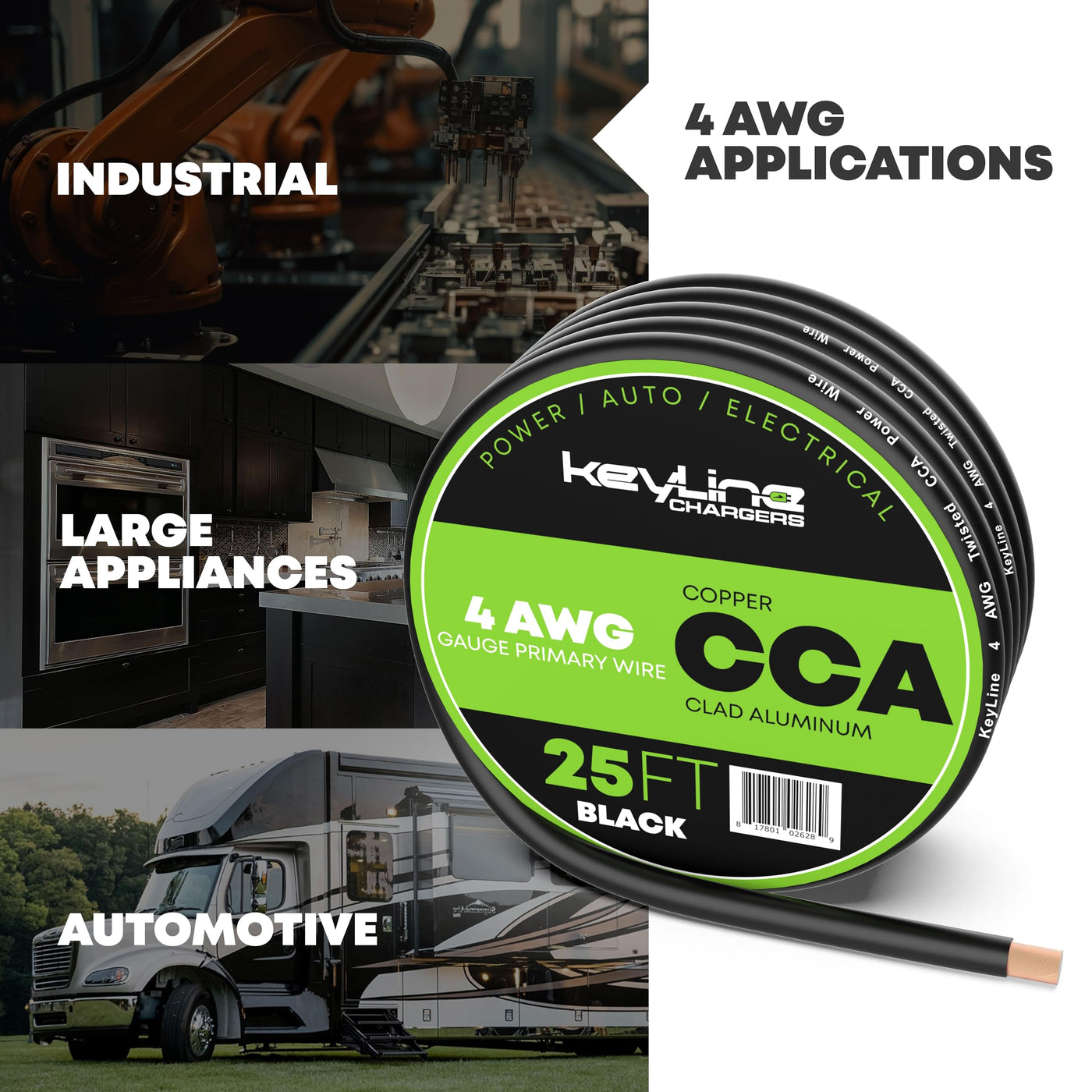 4 Gauge 25-Feet Black Cca Power Ground Wire: This Top-Quality, True 4 Gauge (Awg) Power Ground Wire Is Essential For Ensuring Optimal Power Transfer In Your Wiring Projects. Remember, A Lower Gauge Number Means A Thicker Cable, Reducing Resistance To Current Flow. | 4 Gauge Cca Wire - Copper Clad Aluminum: Our Primary Cable Wire Is Crafted From Copper Clad Aluminum (Cca), Offering An Economical And Highly Efficient Conductor Of Power. Cca Is Ideal For Applications Requiring Ample Power Transfer, Such As Car Audio And Marine Speaker Wire Installations. | Easy Polarity Identification: Simplify Your Installation Process With Our Color-Coded Speaker Cable Or Battery Cable. Accurate Polarity Is Crucial To Prevent Potential Damage To Your Audio Equipment. | Wide Compatibility: This Versatile Cable, Also Known As Speaker Wire, Battery Cable, And Car Speaker Wire, Is Engineered For Up To 300 Volts. With Various Gauge Options, Including 1/0 Awg Copper Clad Wire, This Cable Is Suitable For An Array Of Applications, From Car Audio To Marine Speaker Wire Installations | Power / Ground Wire Set: Our 4 Awg Battery Cable Is An Excellent Choice For Car Amplifiers, Subwoofers, And Electric Wire Installations. It'S Equally Suitable For Various Applications Like Indoor Lighting, Automotive Systems, Car Speakers, And More. Additionally, We Offer 14, 12, 8, 4, 1/0 Gauge Ofc And Cca Wire To Cater To Your Specific Needs.