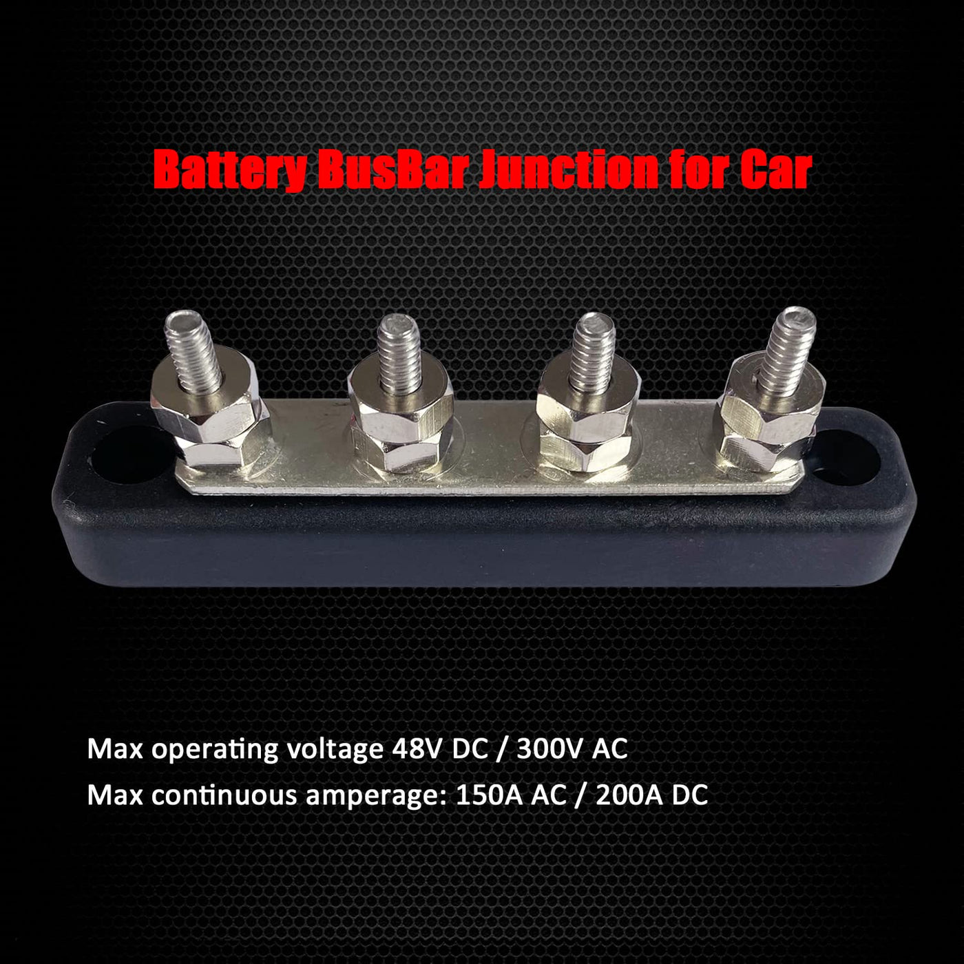 Ampper 4 Terminals 4.2'' Ground Distribution Brass Battery Bus Bar Junction Block. Specifications: 1, Nickle Plated Brass Thick Busbar. 2, Base Is Made Of Heavy Abs, Mechanically Strong, Insulated, Heat Resistant And Flame Resistant, Durable Made For Safety Use. 3, 4 Stainless M5 Terminal Stud. 4, Used For Easy Installation And Route Your Wires With Minimal Effort. 5, Max Operating Voltage 48V Dc / 300V Ac. 6, Max Continuous Amperage: 150A Ac / 200A Dc. 7, This Brass Battery Bus Bar Junction Block Is Widely Used For Car, Vehicle, Rv, Truck, Marine And Boat, Audio, Amplifier, Video, Also Electrical Equipment / Appliances. Complete Kits Includes: 1 Pcs Bus Bar With 4 Stud And Nut