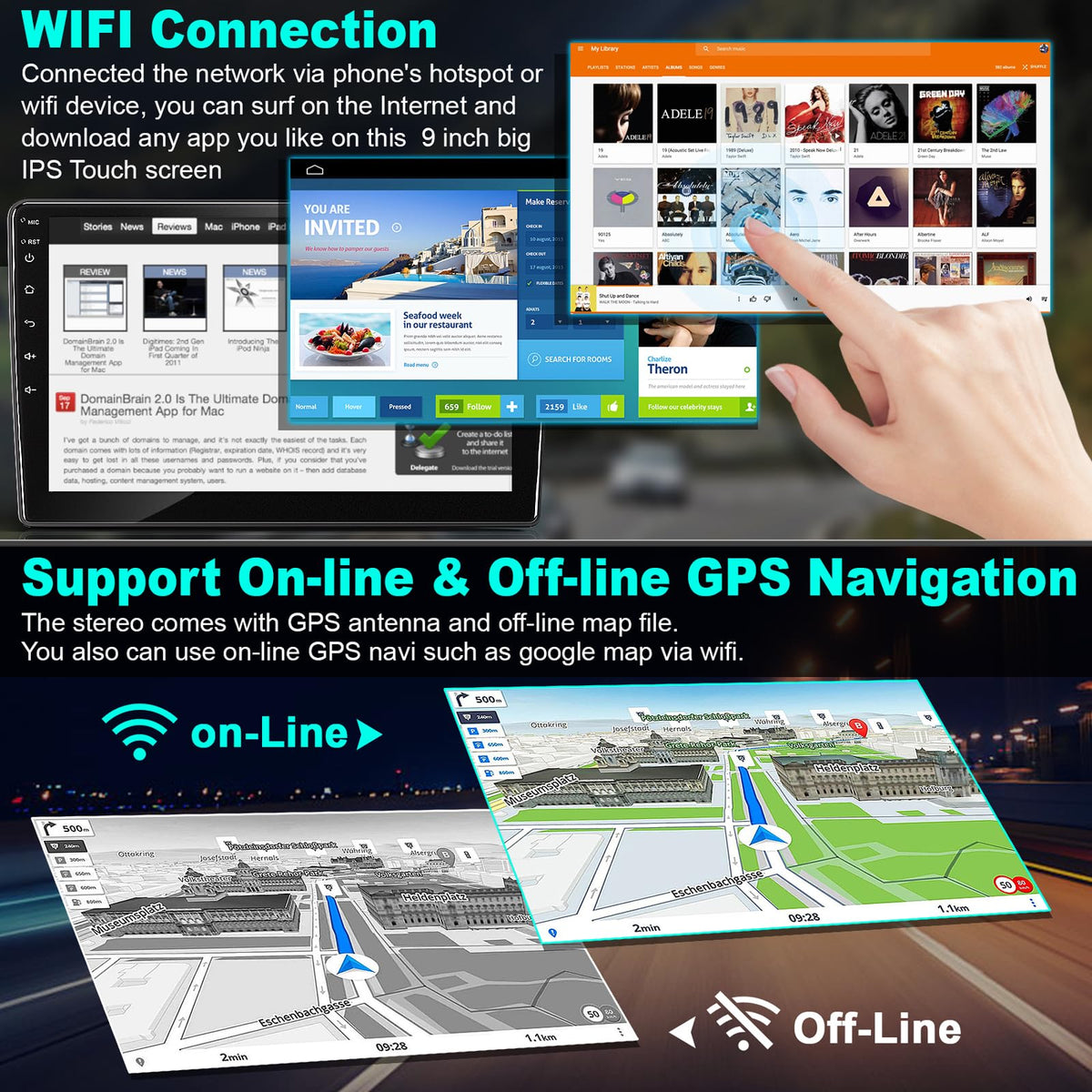 Q: What features does the 9 inch touchscreen offer?A: The 9 inch IPS touchscreen features a resolution of 1024*600, supports 1080P video playback, and allows for a split-screen mode to use two apps simultaneously, enhancing the multimedia experience.