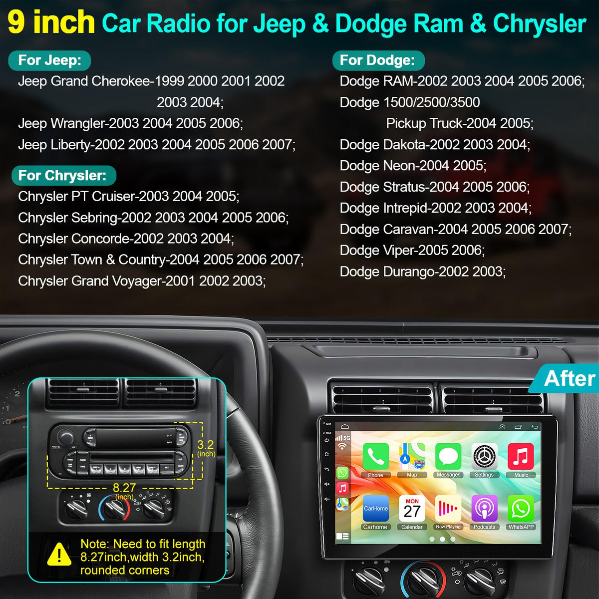 9 Inch Car Stereo Radio For Chrysler 300M-2002 2003 2004 Chrysler Pt Cruiser-2003 2004 2005 Chrysler Sebring-2002 2003 2004 2005 2006 Chrysler Concorde-2002 2003 2004 Chrysler Town & Country-2004 2005 2006 2007 Chrysler Grand Voyager-2001 2002 2003 Jeep Grand Cherokee-1999 2000 2001 2002 2003 2004 Jeep Wrangler-2003 2004 2005 2006 Jeep Liberty-2002 2003 2004 2005 2006 2007 Dodge Ram-2002 2003 2004 2005 2006 Dodge 1500/2500/3500 Pickup Truck-2004-2005 Dodge Dakota-2002 2003 2004 Dodge Neon-2004 2005 Dodge Stratus-2004 2005 2006 Dodge Intrepid-2002 2003 2004 Dodge Caravan-2004 2005 2006 2007 Dodge Viper-2005 2006 Dodge Durango-2002 2003 1. Android 13.0 Operating System 4G Ram & 64G Rom 2. Support Wireless/Wired Apple Carplay & Android Auto 3. Wifi Connect: Built-In Wifi Module, Can Connect To Internet By Wifi Hot Spot, Download App To Watch Online Video Etc. 4. Gps Navigation: Built-In Navigation Module, Support On-Line Off-Line Navigation, Free Navigation Map 5. Bluetooth Function: Built-In Bluetooth Module, Support Bluetooth Phone Connect, Handsfree For Calling Or Bluetooth Music Play 6. Rear View Function: Support Rear View Camera Input, Backing Car More Safer And Convenient (Free Camera Come With Stereo) 7. Radio Tuning: Support Fm Radio, Fm1/Fm2/Fm3 87.5-108 Mhz, You Can Listen The Radio Which Is Your Interested. 8. Rear Dual Usb Port Input: Support Rear Cable Usb Input, Can Play Music/Movie Or Wire Carplay Android Auto 9. Screen: 2.5D 9 Inch Capacitive Touch Screen, 1024*600 Resolution, Support 1080P Video 10. Improve Sound Quality With Equalizer, Use Dsp Eq To Adjust The Sound To Render Better Result 11. Split Screen Function: You Can Use 2 App At The Same Time When You Use Split Screen Function 12. Swc Function:You Can Control The Stereo With Your Steering Wheel