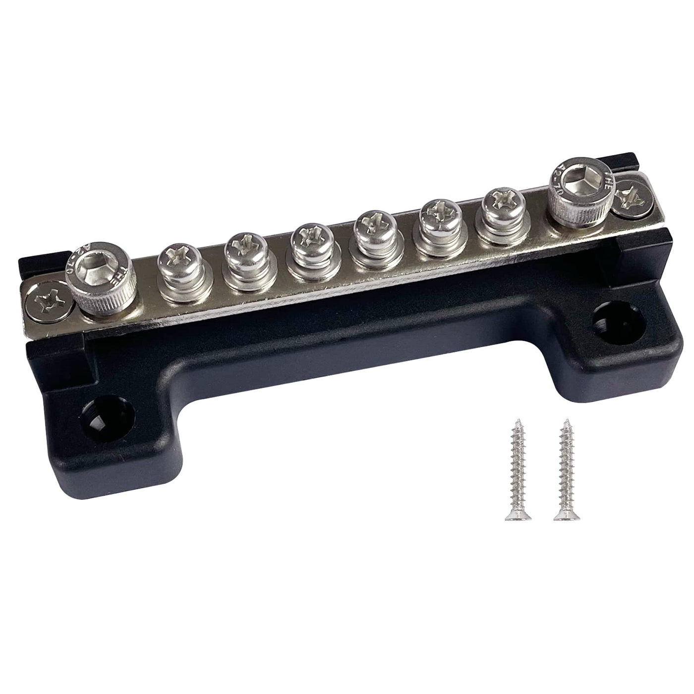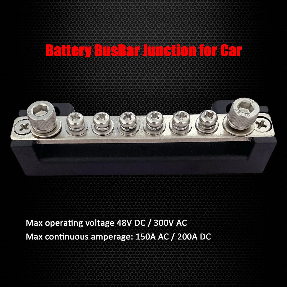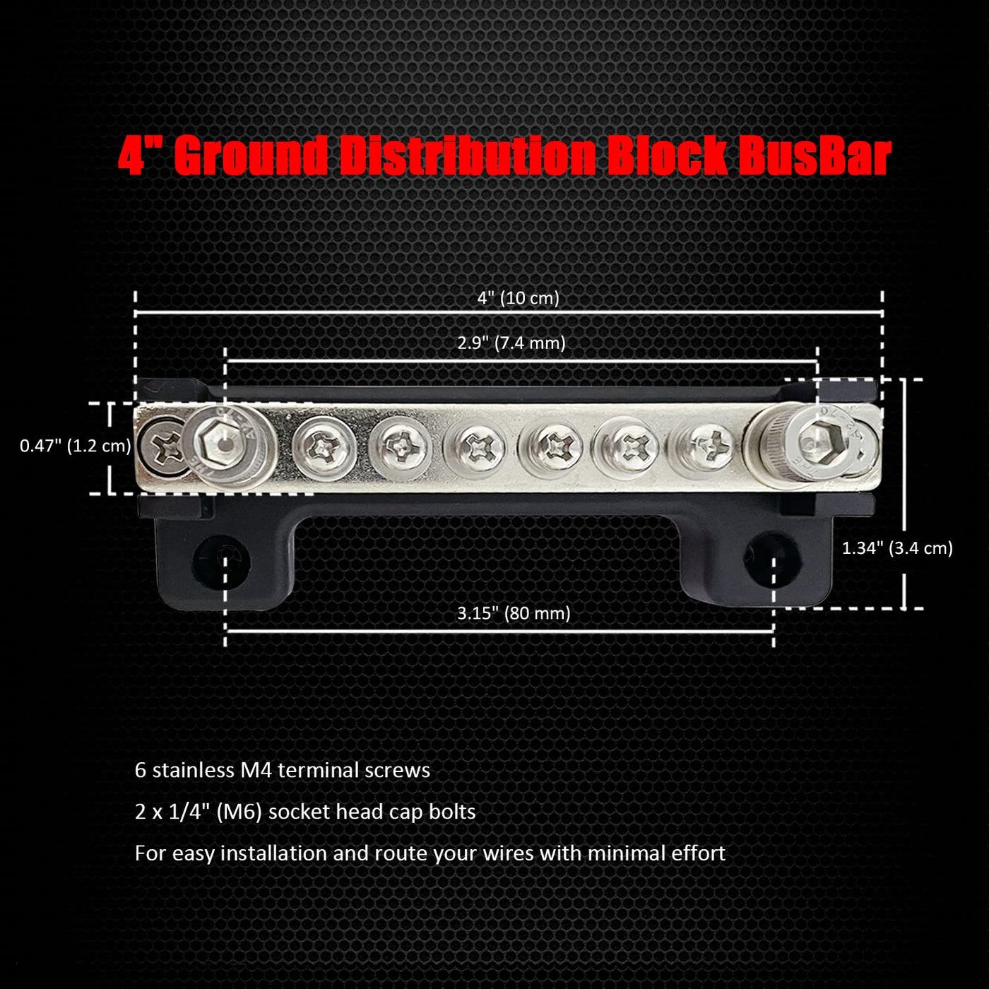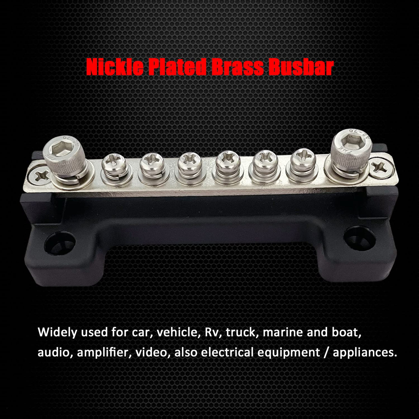 Ampper 6 Terminals 4'' Power / Ground Distribution Brass Battery Bus Bar Junction Block. Specifications: 1, Nickle Plated Brass Thick Busbar. 2, Base Is Made Of Heavy Abs, Mechanically Strong, Insulated, Heat Resistant And Flame Resistant, Durable Made For Safety Use. 3, 6 Stainless M4 Terminal Screws, 2 X 1/4'' (M6) Socket Head Cap Screws. 4, Used For Easy Installation And Route Your Wires With Minimal Effort. 5, Max Operating Voltage 48V Dc / 300V Ac. 6, Max Continuous Amperage: 150A Ac / 200A Dc. 7, This Brass Battery Bus Bar Junction Block Is Widely Used For Car, Vehicle, Rv, Truck, Marine And Boat, Audio, Amplifier, Video, Also Electrical Equipment / Appliances. Complete Kits Includes: 1 Pcs Bus Bar With 6 Screws And 2 Cap Screws 2 Pcs Installation Screws