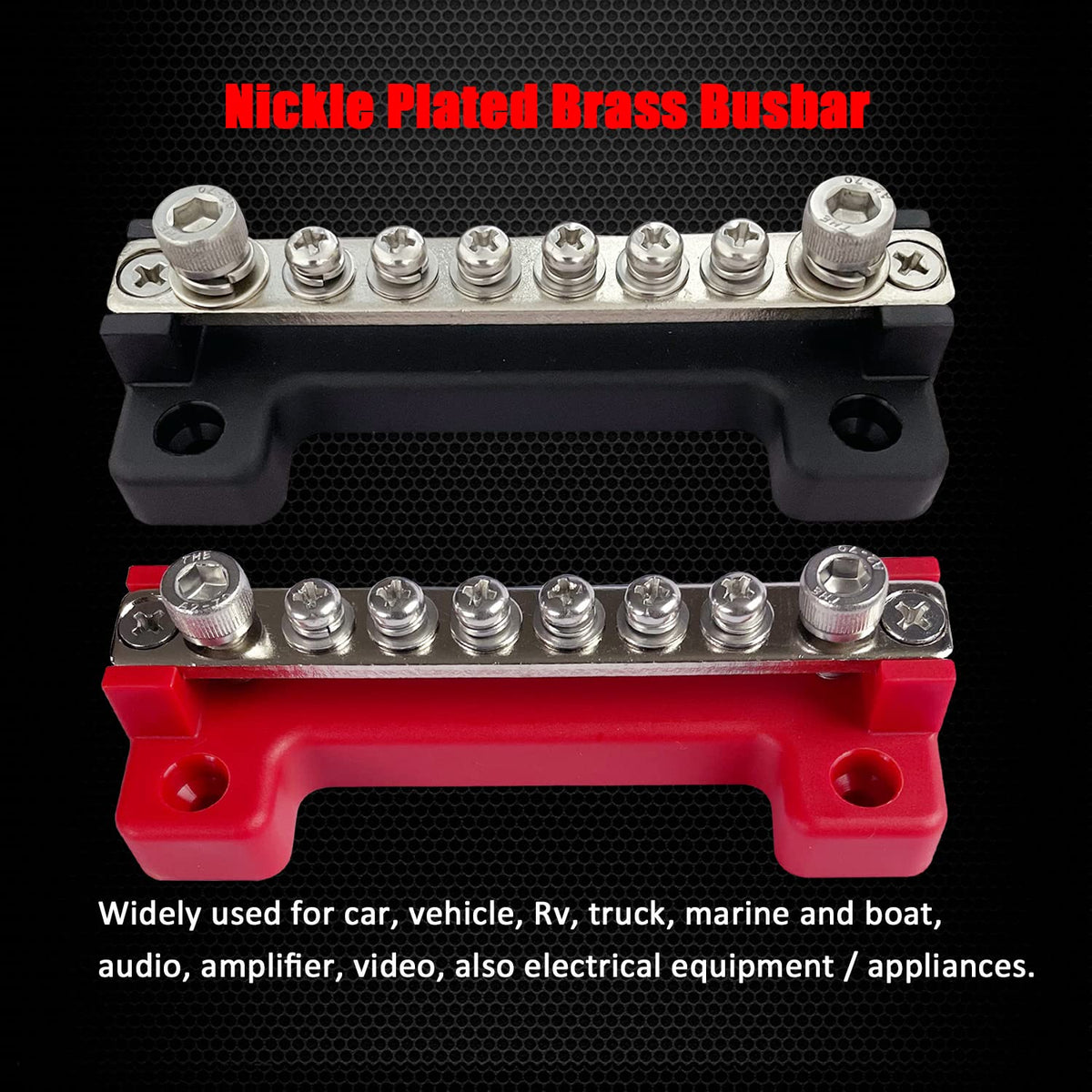 Ampper 6 Terminals 4'' Power / Ground Distribution Brass Battery Bus Bar Junction Block. Specifications: 1, Nickle Plated Brass Thick Busbar. 2, Base Is Made Of Heavy Abs, Mechanically Strong, Insulated, Heat Resistant And Flame Resistant, Durable Made For Safety Use. 3, 6 Stainless M4 Terminal Screws, 2 X 1/4'' (M6) Socket Head Cap Screws. 4, Used For Easy Installation And Route Your Wires With Minimal Effort. 5, Max Operating Voltage 48V Dc / 300V Ac. 6, Max Continuous Amperage: 150A Ac / 200A Dc. 7, This Brass Battery Bus Bar Junction Block Is Widely Used For Car, Vehicle, Rv, Truck, Marine And Boat, Audio, Amplifier, Video, Also Electrical Equipment / Appliances. Complete Kits Includes: 2 Pcs Bus Bar With 6 Screws And 2 Cap Screws 4 Pcs Installation Screws