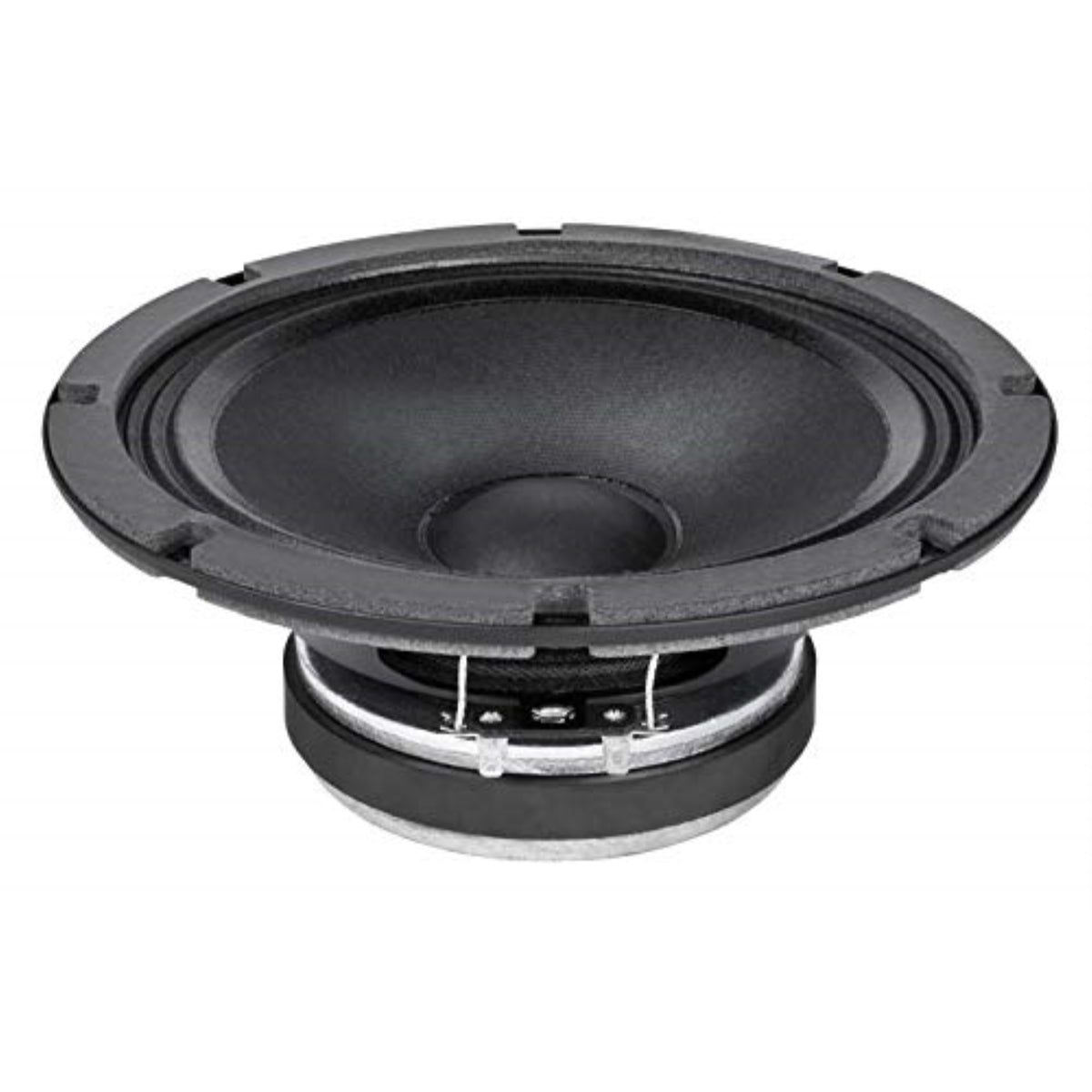 Nominal Diameter 200 mm (8 in). Overall Diameter 209.2 mm (8.24 in). Bolt Circle Diameter 196.9 mm (7.75 in). Baffle Cutout Diameter 178 mm (7.01 in). Depth 89 mm (3.50 in). Flange and Gasket Thickness 8 mm (0.31 in). Net Weight 2.2 kg (4.7 lb). Shipping Box: (Single Carton Box) 227 x 224 x 113 mm; (8.9 x 8.8 x 4.4 in). Shipping Weight 3 kg (6.6 lb) . Nominal Impedance 4 Ohm. Minimum Impedance 3.6 Ohm. AES Power Handling (1) 130 W. Maximum Power Handling (2) 260 W. Sensitivity (1W/1m) 95 dB. Frequency Range 60hz-5000 Hz. Voice Coil Diameter 37 mm (1.46 in). Winding Material Al. Former Material Kapton. Winding Depth 11.9 mm (0.47 in). Magnetic Gap Depth 8 mm (0.31 in). Flux Density 1 T. Magnet Ferrite Ring. Basket Material Steel. Cone Surround (3) Triple Roll. NET Air Volume filled by Loudspeaker 0.6 dm-3 (0.021 ft-3). Spider Profile 1x constant height waves. THIELE AND SMALL PARAMETERS. Fs 80 Hz. Re 3 Ohm. Qes 0.47. Qms 8.7. Qts 0.45. Vas 15.8 dm-3 (0.56 ft-3). Sd 209 cm-2 (32.44 in-2). Xmax (4) 4.62 mm. Xdamage (5) 10.4 mm. Mms 15.3 g. Bl 7 N/A. Le 0.25 mH. Mmd 11.9 g. Cms 0.26 mm/N. Rms 0.9 kg/s. Eta Zero 1.67 %. EBP 170 Hz . PART NUMBER (P/N): Faston Terminals - 4 Ohm Version 02004056 NOTES:. (1) 2 Hours Test According to AES 2-1984 Rev. 2003. (2) Maximum power is defined as 3dB greater than nominal power.. (3) Treated Polycotton. (4) Xmax= [(winding depth - magnetic gap depth)/2] + (magnetic gap depth/3). (5) Maximum excursion before permanent damage