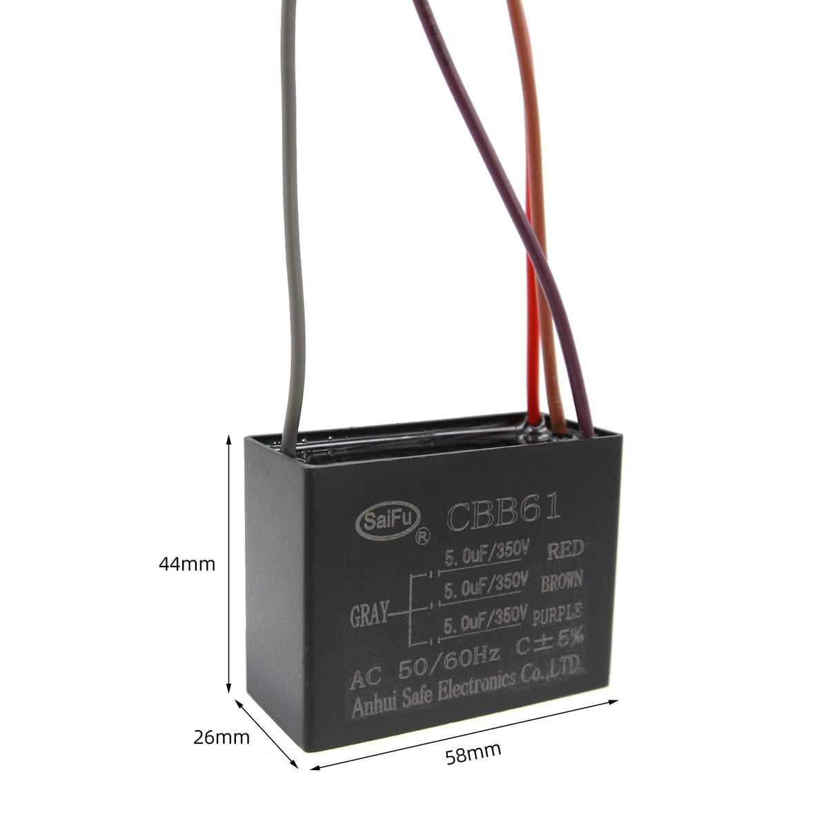 Specifications: Model: Cbb61 Shell Color: Black Shell: Plastic Shell Capacity : 5Uf+5Uf+5Uf&Plusmn;5% Rated Voltage: 350V Ac Rated Frequency: 50/60Hz Operating Temperature:-40?~85? Size:58X44X26Mm/2.3X1.7X1.0In(L X H X W). Note: Please Allow 1-3Mm Error Due To Manual Measurement. Please Make Sure You Do Not Mind Before You Bid. Product Features: Small Loss, Strong Moisture Resistance, Excellent Electrical Performance, Strong Reliability, Large Capacity, Long Service Life And Good Self-Healing Performance. Cbb61 Capacitors Control The Start And Stop Mechanisms And Speeds On Many Different Types Of Electrical Appliances. This Product Is Suitable For Starting And Running The Ac Motors Of Electric Fans, Washing Machines, Refrigerators, Air Conditioners And Other Equipment And Instruments. &Nbsp;