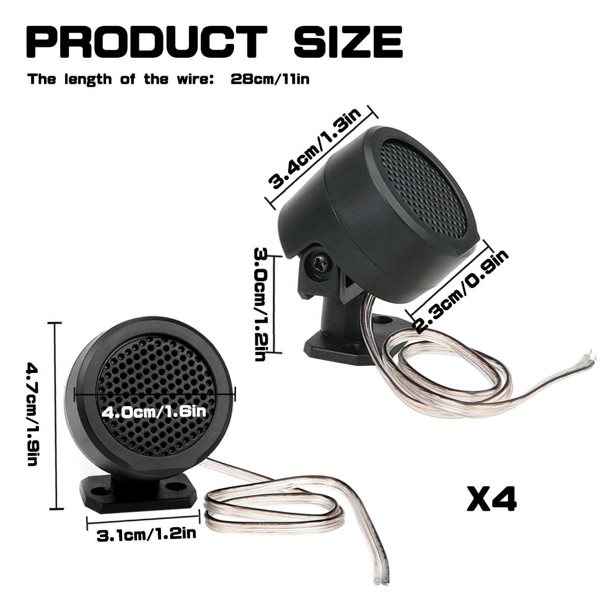 Non-Destructive Sound Quality: Our Car Tweeter Is Suitable For Installation Both In The Car And At Home. Suitable For Various Music Styles, Classical, Rock, Etc., So You Can Enjoy Lossless Music. Features: 1.High Efficiency Dome Tweeter.For All Car Audio Systems. 2.High Hardness, Sturdiness, Corrosion Resistance, Not Easy To Rust, And Long Service. 3.Compact Size And Easy To Install. Specifications: Impedance: 4O Voltage: 12V Frequency Range (Hz): 5Khz - 20Khz Signal To Noise Ratio: 105Db Audio Sensitivity: 91Db Out Power: 500W Material Type: Abs Car Make: Universal Sound Pressure: 105 Decibels (1 Meter, 1 Watt Power) Sound Diffusion: 90 Degrees Package List: 2 * Car Tweeters 4 * Screws 360 Surround Sound - High Sound Stereo Surround, So You Can Feel The Original Sound Of The Song, High-Quality Output, Clear And Pleasant, No Sound Loss
