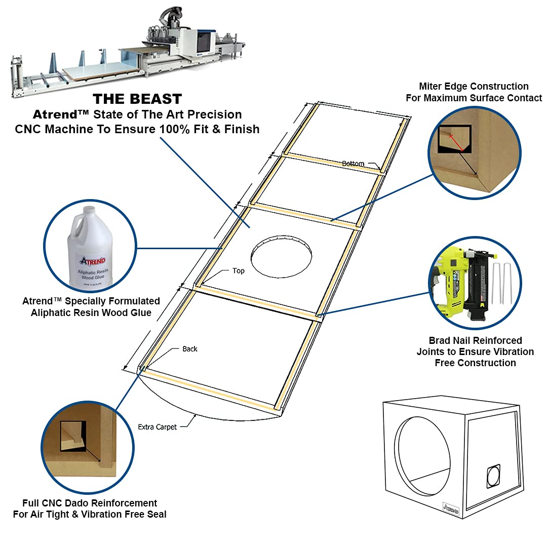 Q: What makes the Atrend 15SA enclosure different from other subwoofer enclosures?A: The Atrend 15SA features CNC Miter & Dado construction for an airtight fit, specially formulated wood glue for sealing, and pneumatic brad nails for enhanced durability, which all contribute to superior sound performance compared to standard enclosures.