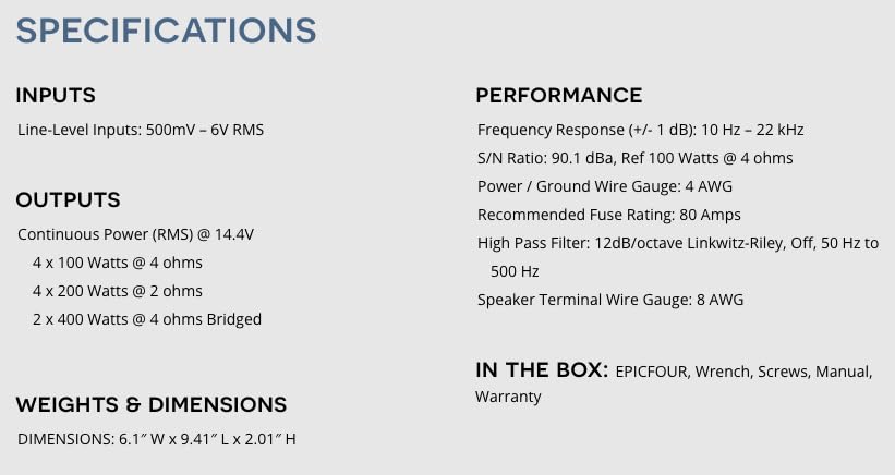 Q: What makes the AudioControl EPICFOUR a reliable choice for car audio?A: The EPICFOUR is built with a robust design featuring solid power/speaker terminals secured by hex screws and a smart auto-reset protection circuit. These features help prevent damage during operation, ensuring long-lasting performance and reliability in diverse conditions.