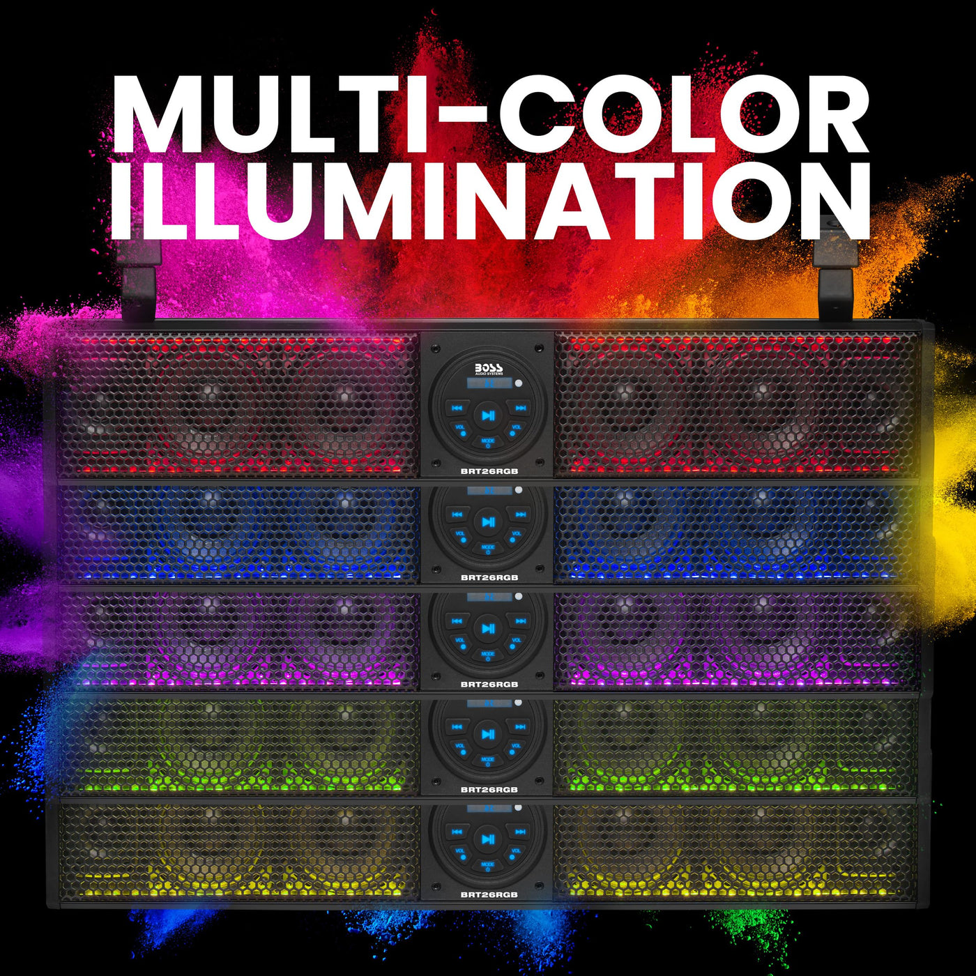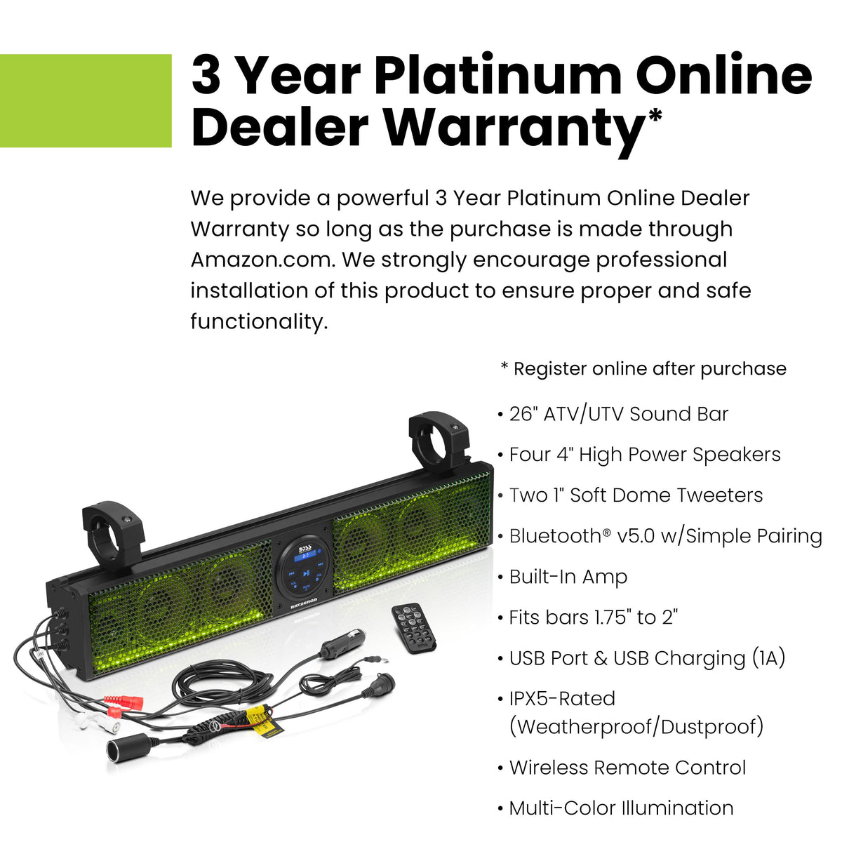 Boss Audio Systems Brt26Rgb Atv Utv Sound Bar - 26 Inches Wide, 4 Inch Speakers, 1 Inch Tweeters, Ipx5 Weatherproof, Bluetooth, Built-In Amplifier, Multicolor Illumination, Golf Cart Compatible