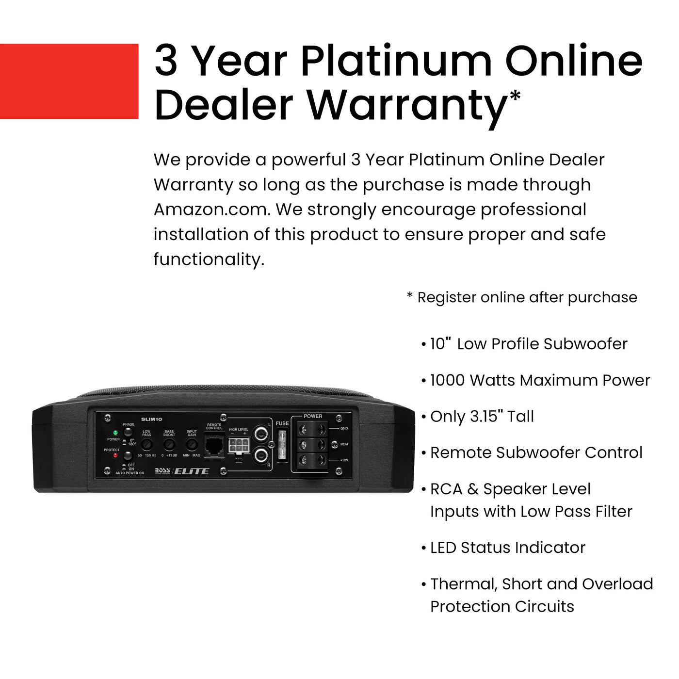 Q: What kind of warranty does the SLIM10 subwoofer have?A: BOSS Audio Systems provides a powerful 3 Year Platinum Online Dealer Warranty for the SLIM10, provided the purchase is made through Amazon.com.