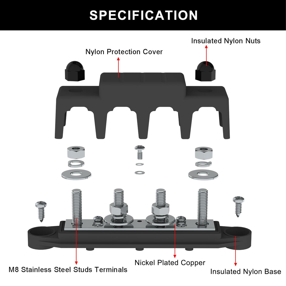 Q: What materials are used in the construction of this bus bar?A: This bus bar is constructed with reinforced nylon flame retardant material, featuring a nickel-plated brass contact plate for consistent flow and stability, along with stainless steel components for excellent durability and corrosion resistance.